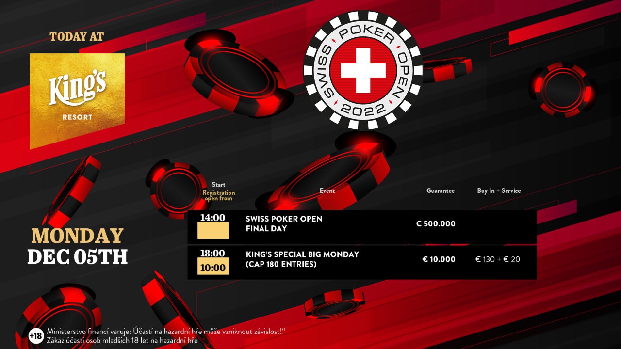 Heute steht im King’s Resort neben dem Finale des Swiss Poker Open Main Event um 14 Uhr auch noch das €130+20 King’s Special Big Monday mit einer Garantie von €10.000 auf dem Programm.