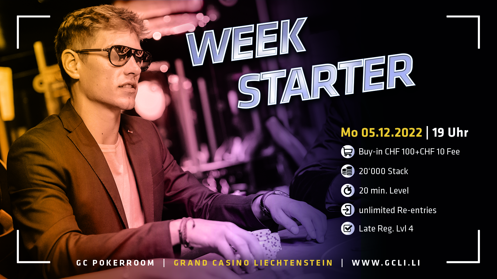 Heute steht im Grand Casino Liechtenstein wieder der CHF100+10 Weekstarter auf dem Programm. Los geht es um 19 Uhr mit 20.000 Chips und zwanzigminütigen Levels. Bis zum vierten Level sind unbegrenzte Re-Entrys möglich.