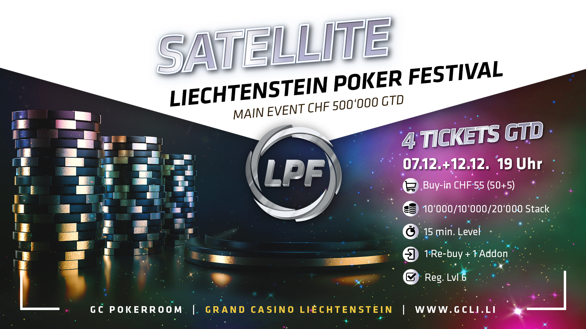 Am Mittwoch findet das zweite CHF 50+5 Satellite für den Liechtenstein Poker Festival (LPF) Main Event statt. Hier sind vier Tickets im Wert von CHF 400 garantiert. Man startet mit 10.000 in Chips und ein Rebuy (CHF 50 = 10.000 Chips) und ein Add-On (CHF 50 = 20.000 Chips) sind möglich. Jeder Level dauert beim Satellite 15 Minuten. Die Late-Registration ist für sechs Levels geöffnet.