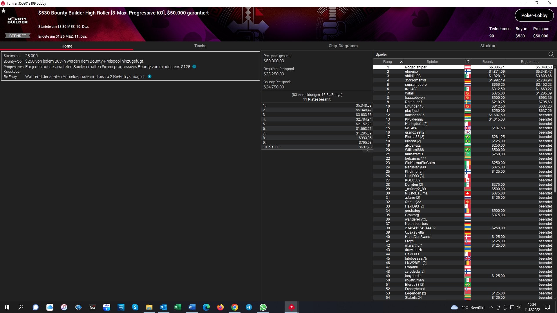 Das $530 Bounty Builder High Roller Event durfte insgesamt 99 Entries verbuchen und damit ging es um die Garantiesumme von $50.000. Den Sieg und $5.348 + $6.886 Bounties schnappte sich der Österrreicher „Gogac sniper“. Der Deutsche „suprambropro“ belegte noch Platz 4 für $2.784 + $1.992 Bounties.
