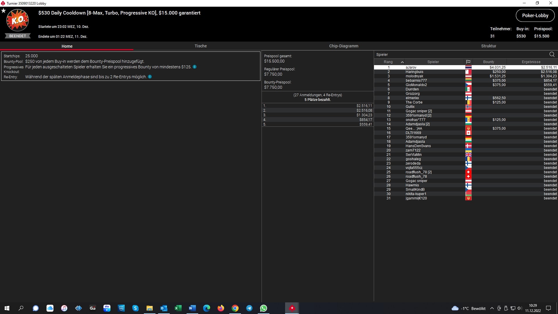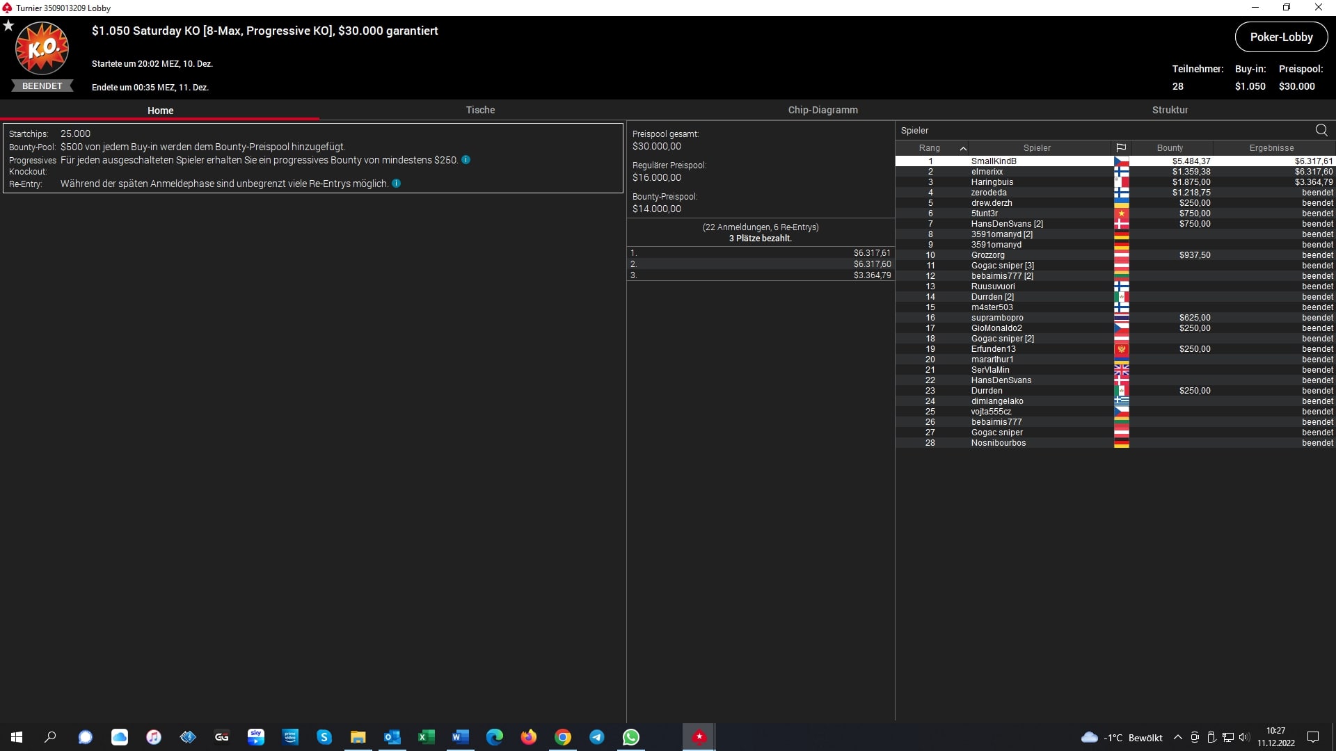 Beim $1.050 Saturday KO Event konnte sich der Tscheche Michael „SmallKindB“ Sklenicka gegen 27 Gegner durchsetzen und das Turnier für $6.317 + $5.484 Bounties gewinnen.