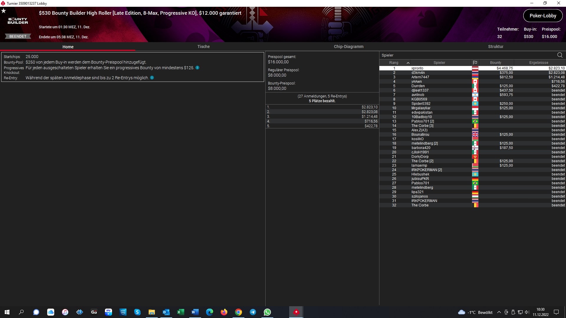 Dann gab es noch Siege für, „000000000136“ (MLT – $1.473 + $3.761 Bounties) beim $320 Bounty Builder, Anton „aJarov“ Yakuba (UKR/THA – $2.516 + $4.031 Bounties) beim $530 Daily Cooldown und für „xpronto“ (LAT – $2.823 + $4.468 Bounties) beim $530 Bounty Builder High Roller Late-Edition Event.