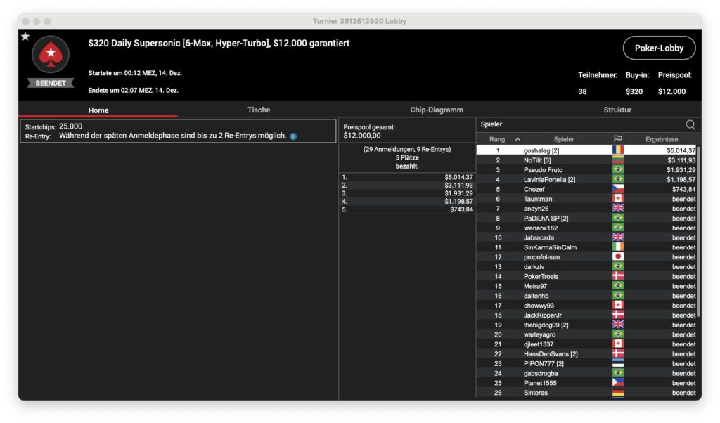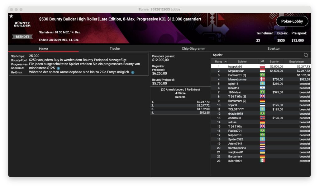 Das $320 Daily Supersonic hatte bei 38 Entries einen $12.000 Preispool durch die Garantie. Der Sieg ging an „goshaleg“ aus Rumänien für $5.014. Die Late-Edition des $530 Bounty Builder HR hatte ebenfalls $12.000 Preispool. „happyk99“ gewann hier für $2.500 + $2.247.