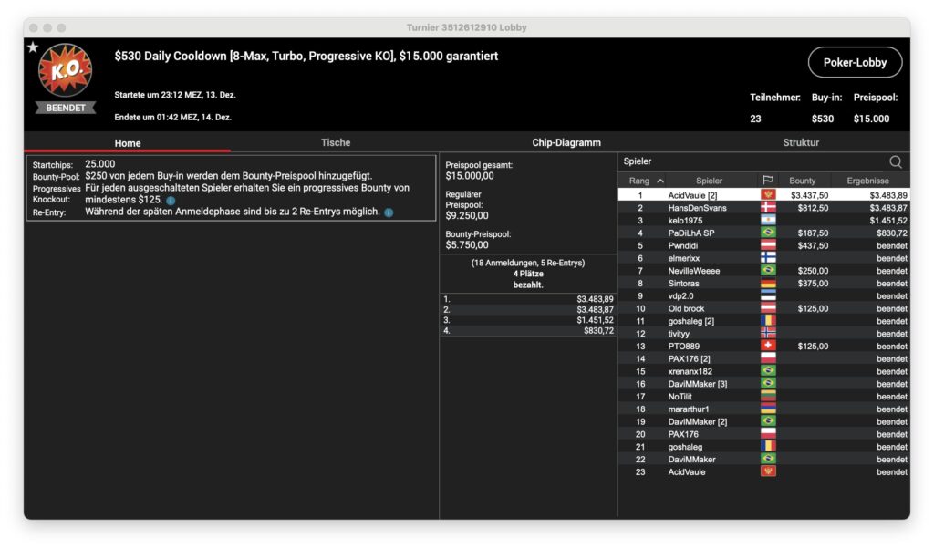 Das $530 Daily Cooldown hatte 23 Entries. Auch hier gab es ein kleines Overlay, $15.000 wurden hier im Garantie-Preispool auf vier Spieler verteilt. Der Sieg ging an „AcidVaule“ aus Montenegro für $3.437 + $3.483.