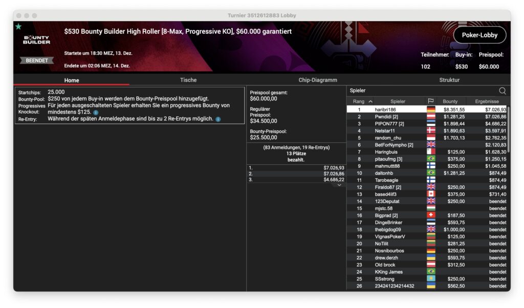 „haribri186“ aus Deutschland schnappte sich das $530 Bounty Builder HR, das an diesem Abend 102 Runner hatte. $60.000 lagen durch die Garantie im Preispool, ein kleines Overlay wurde an die Spieler ausgespielt. Der Sieg brachte „haribri186“ $8.351 + $7.026 ein. Runner-Up wurde Alex „Pwndidi“ Theologis für $1.281 + 7.026.