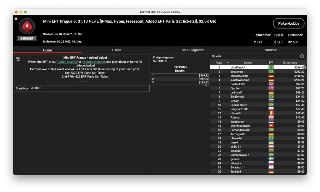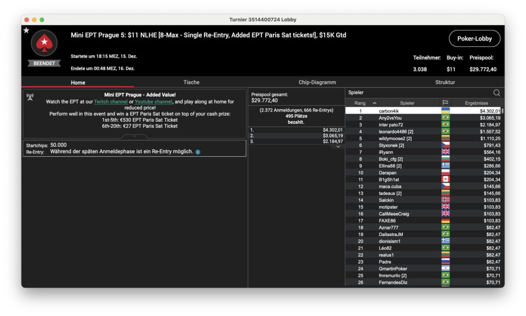 Drei Turniere gab es bei der Mini EPT Prag: Das $1,10 NLH gewann der Brasilianer „VidaPlenAA“ für $369, das $11 NLHE „carbon4ik“ für $4.302 aus der Ukraine und das $5,50 8Game ging an „00Beano“ aus Großbritannien für $452.