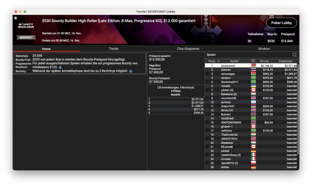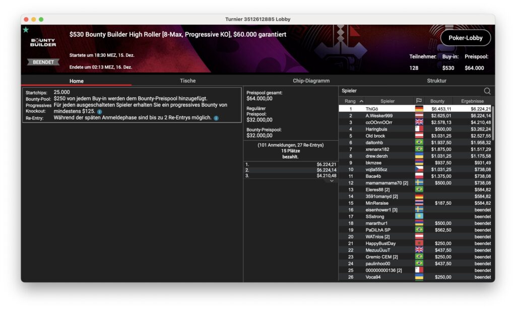 Bei den High Rollern konnte sich im Bounty Builder HR, zu dem an diesem Abend 128 Entries von 101 Spielern zustande kamen, der deutsche Spieler „ThiGö“ durchsetzen. $6.453 + 6.224 gab es für den Sieg.
