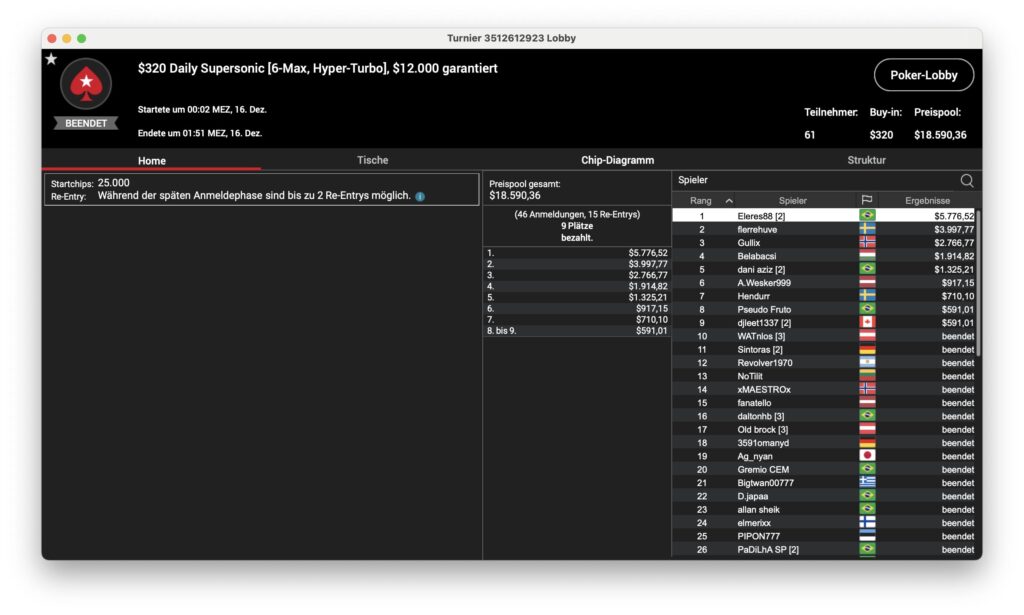 Das $320 Daily Supersonic ging an den Brasilianer „Eleres88“ für $5.776. 61 Entries sorgten hier für $18.590 Preispool.
