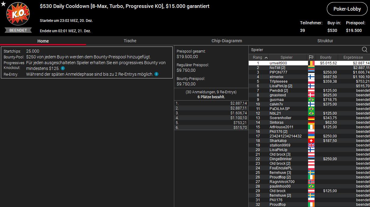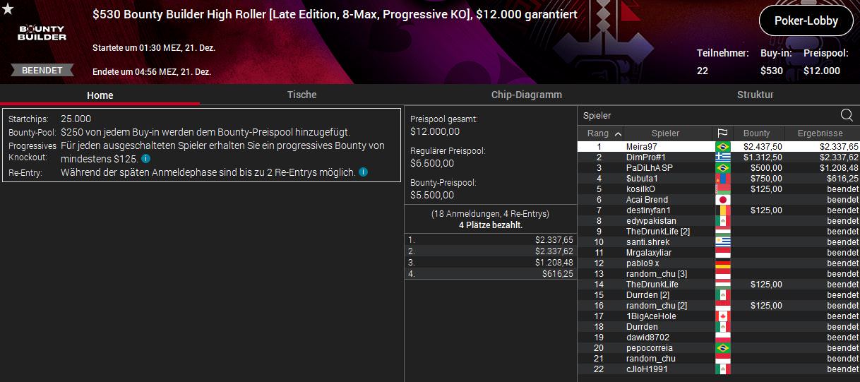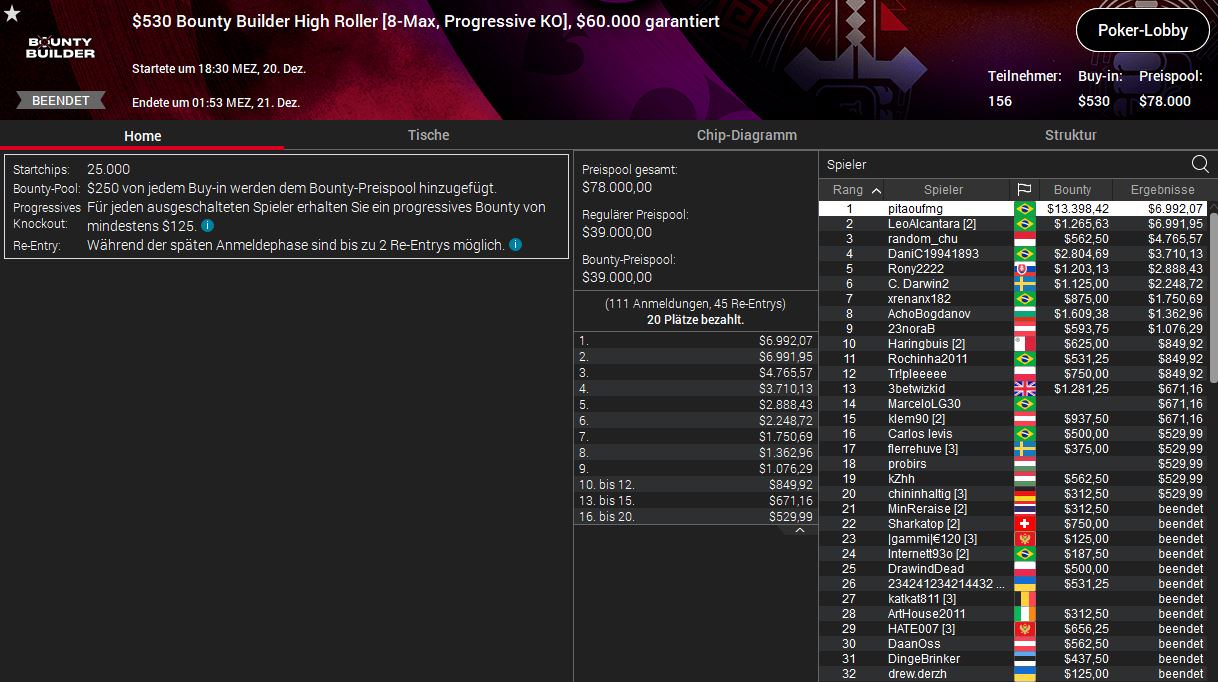 Der Deutsche RoadTooGlory sicherte sich den Sieg beim $320 Bounty Builder für $3.290 Preisgeld plus $5.662 an Bounties vor dem Niederländer Jepser8 ($3.290/$1.293). Insgesamt wurden hier bei 109 Entries $32.700 ausgespielt.