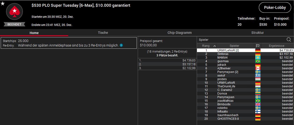 Bei $530 PLO Super Tuesday gab es 20 Entries, sodass die garantierten $10.000 exakt erreicht wurden. URMYLeN0R aus Deutschland feierte den Sieg für $4.739 vor Landsmann Sintoras ($3.157). Sintoras belegte zudem noch Platz drei für $1.868 beim $320 Daily Supersonic.