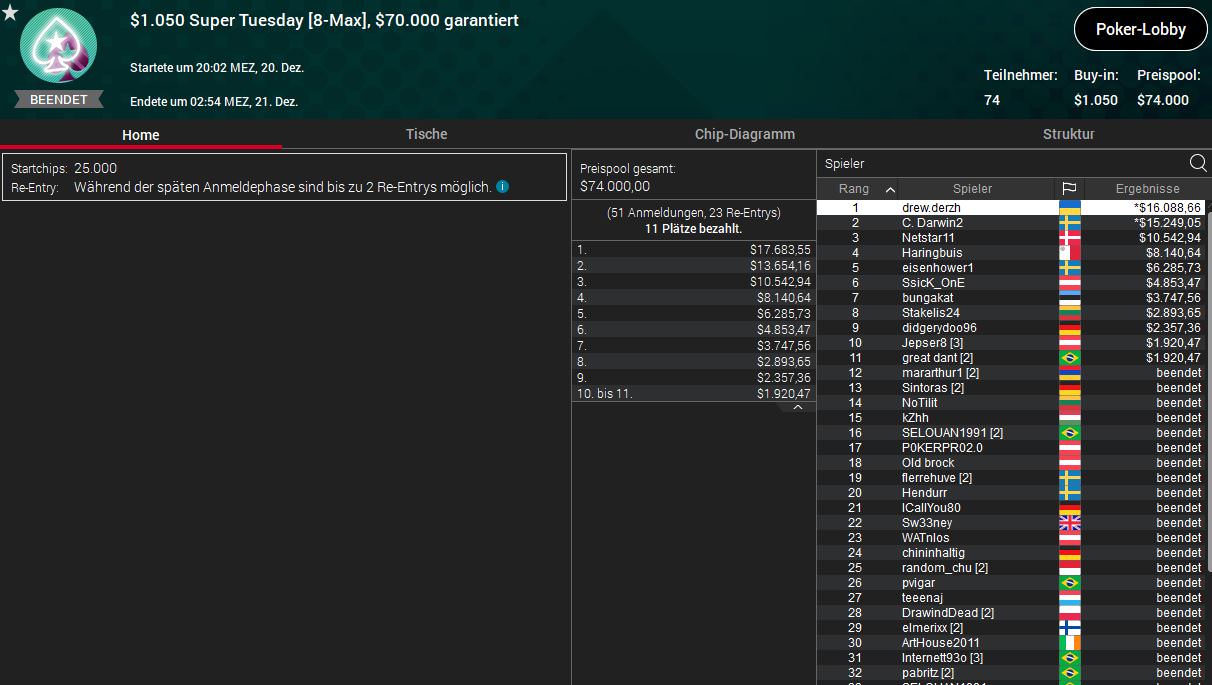Den Sieg beim $1.050 Super Tuesday feierte drew.derzh aus der Ukraine für $16.088 nach einem Deal mit Simon C. Darwin2 Mattsson ($15.249). Claas Segebrecht kassierte als Sechster immerhin $4.853 Preisgeld.