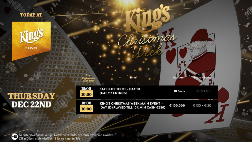 Flight drei des €130+20 Main Event der King’s Christmas Week im King’s Resort, dem größten Pokerroom Europas, in Rozvadov ist gespielt. €100.000 werden in dem Turnier garantiert.