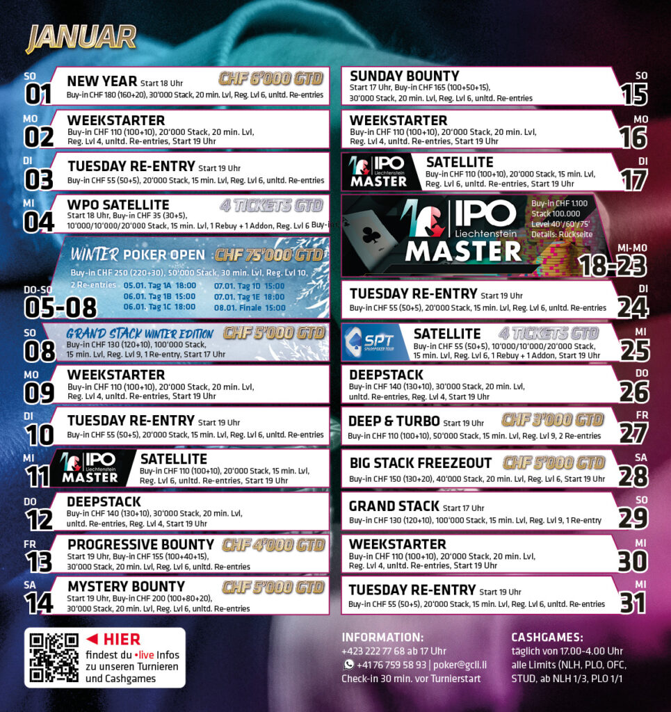 Der Januar im Grand Casino Liechtenstein bietet ein volles Programm. Jeden Tag gibt es Pokeraction in Form von Turnieren und sowieso an den Cash Game-Tischen.