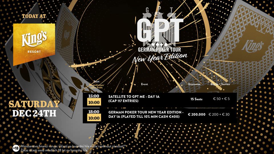 Heute wird im King’s ebenfalls gepokert, schon um 15 Uhr geht es mit dem €50+5 Satellite zum Main Event der German Poker Tour New Year Edition los. Hier werden 15 Plätze für Tag 1A garantiert, der ab 18 Uhr ausgetragen wird und regulär €200+30 kostet.