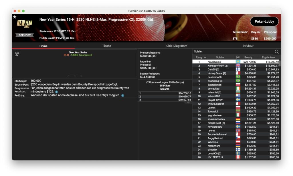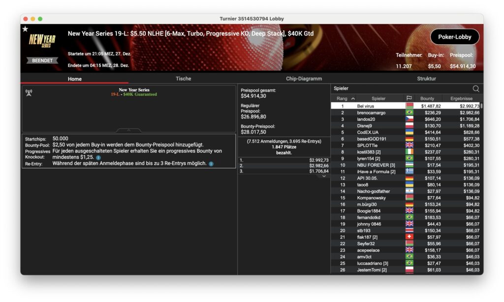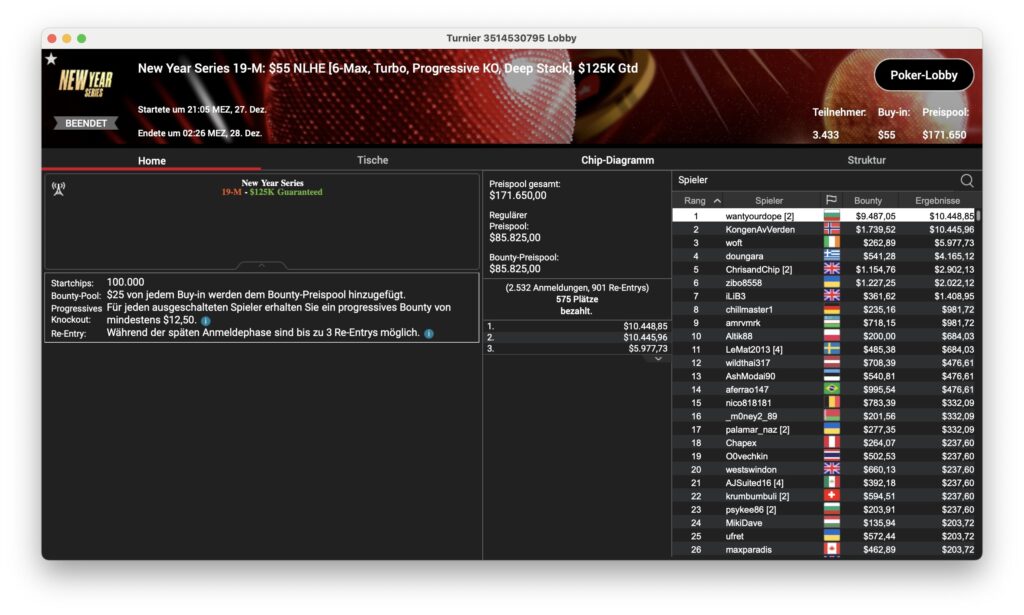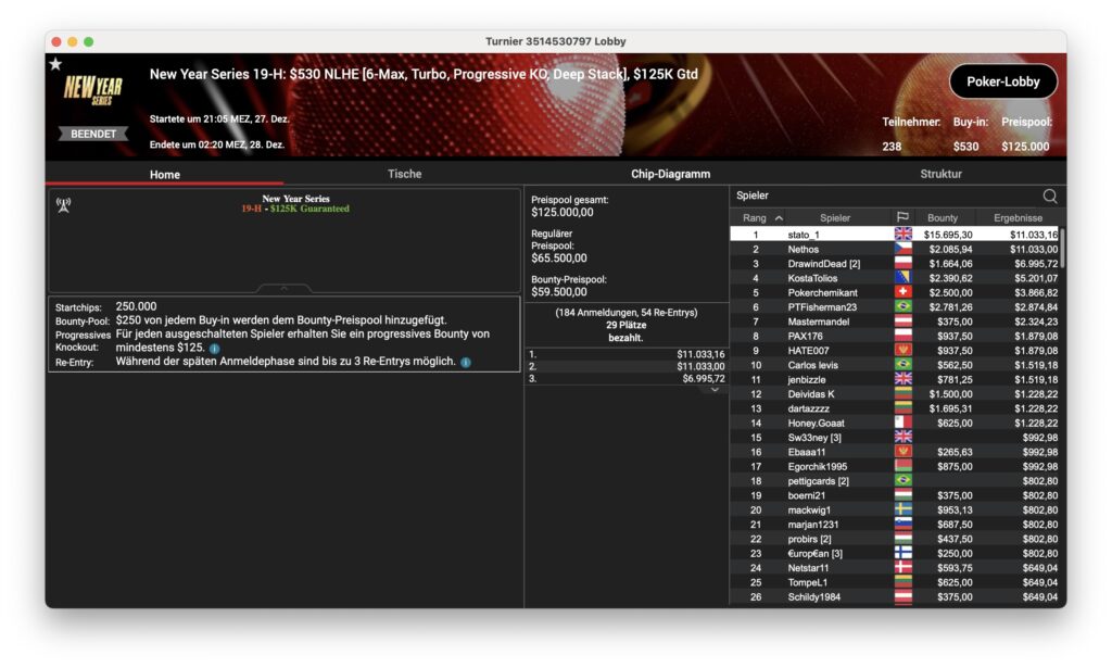 Andrew „stato_1“ Hulme holte sich bei der New Year Series das Event 19-H, ein $530 PKO Turbo, mit 238 Teilnehmern und $125.000 Garantie-Preispool. $15.695 + $11.033 gab es für Platz 1.