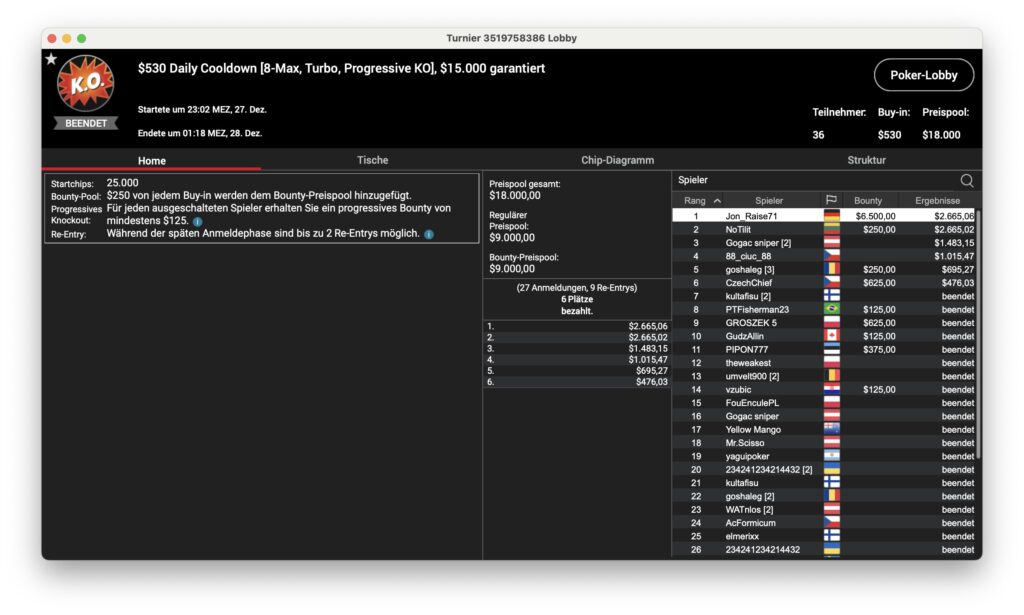 „Jon_Raise71“ konnte sich den Sieg beim $530 Daily Cooldown schnappen. Aus dem $18.000 Preispool gab es für den deutschen Spieler $6.500 + $2.665. 36 Spieler versuchten sich an dem Turnier.
