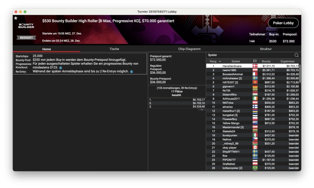 Das $530 Bounty Builder HR hatte 144 Runner und damit einen $72.000 Preispool. Der Sieg ging an den Dänen „HansDenSvans“, der mit $7.511 + $6.703 aus dem Turnier ging.