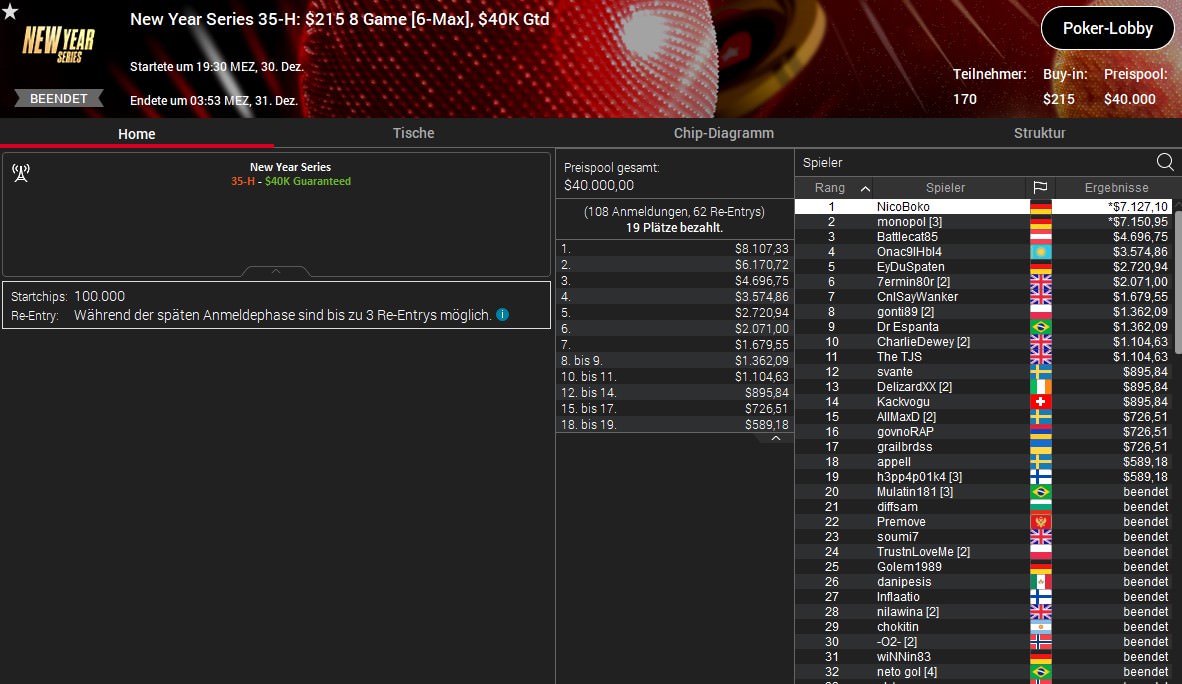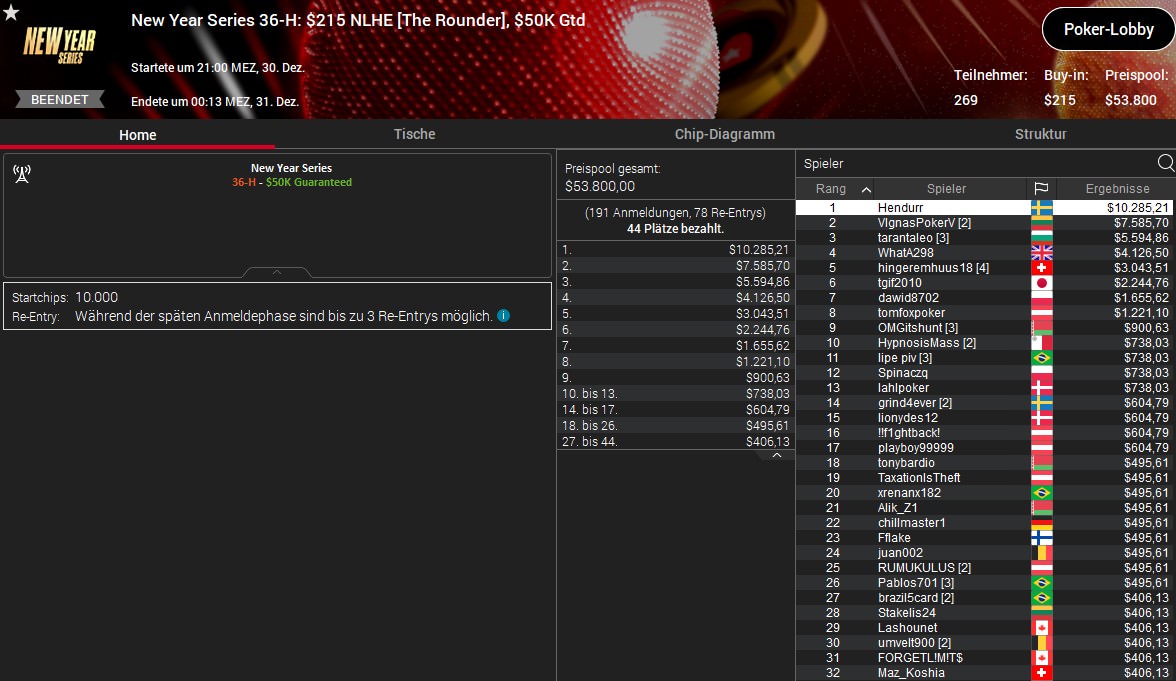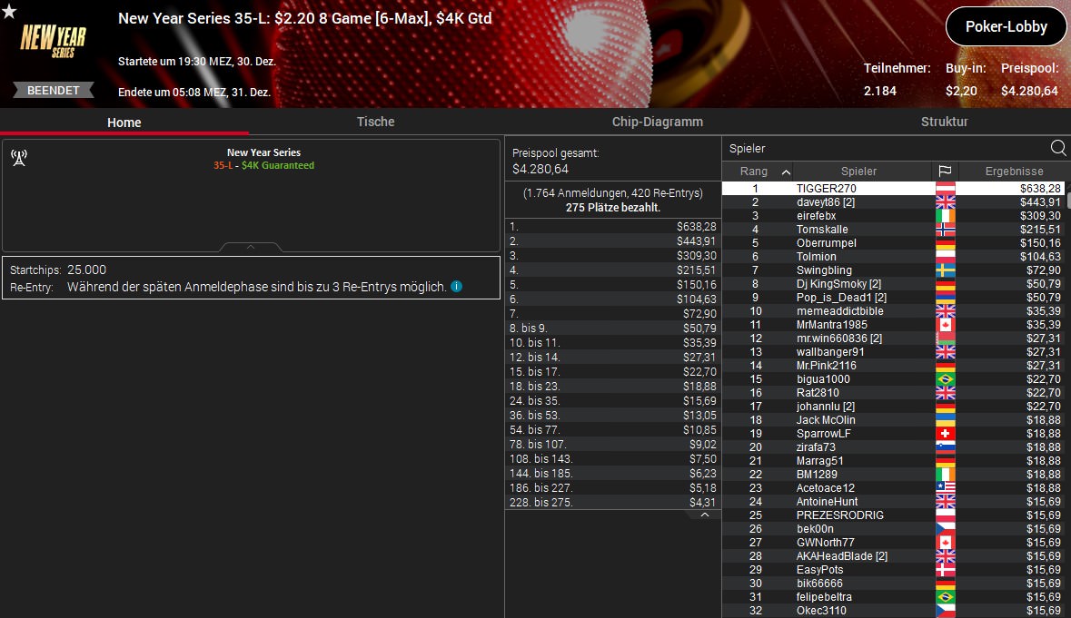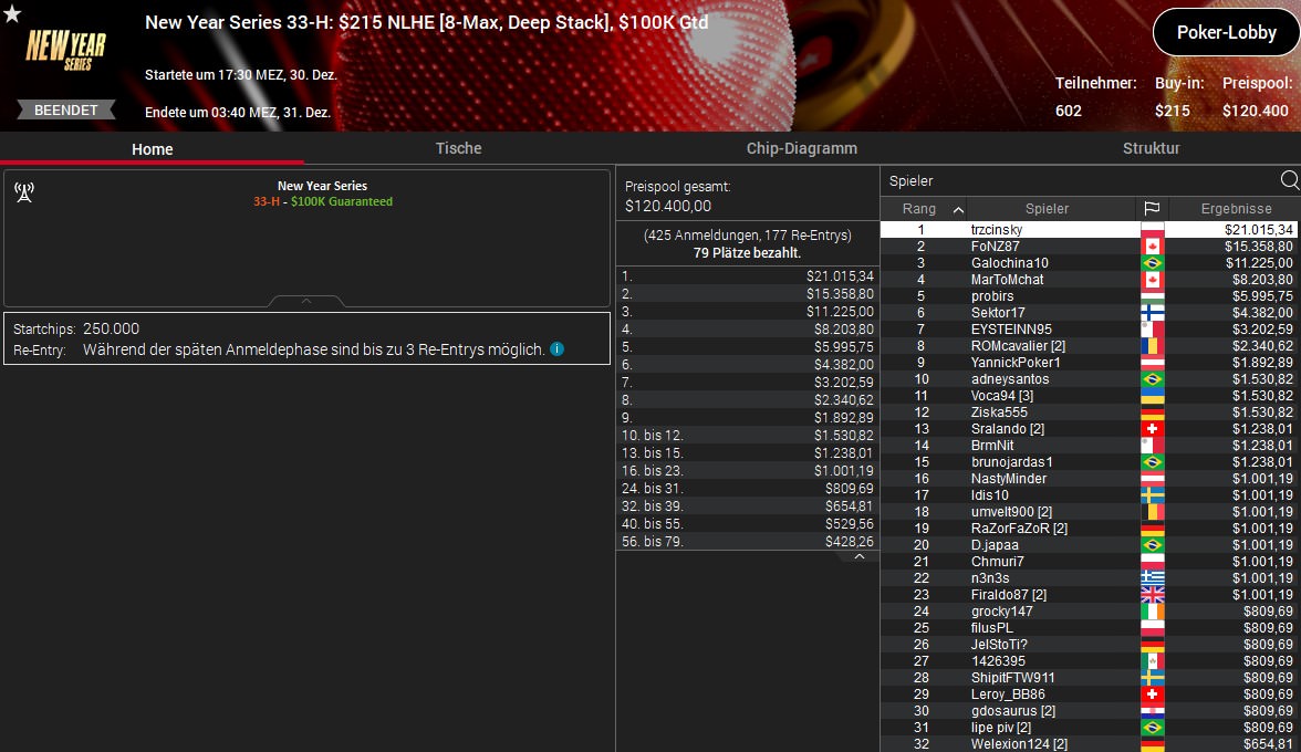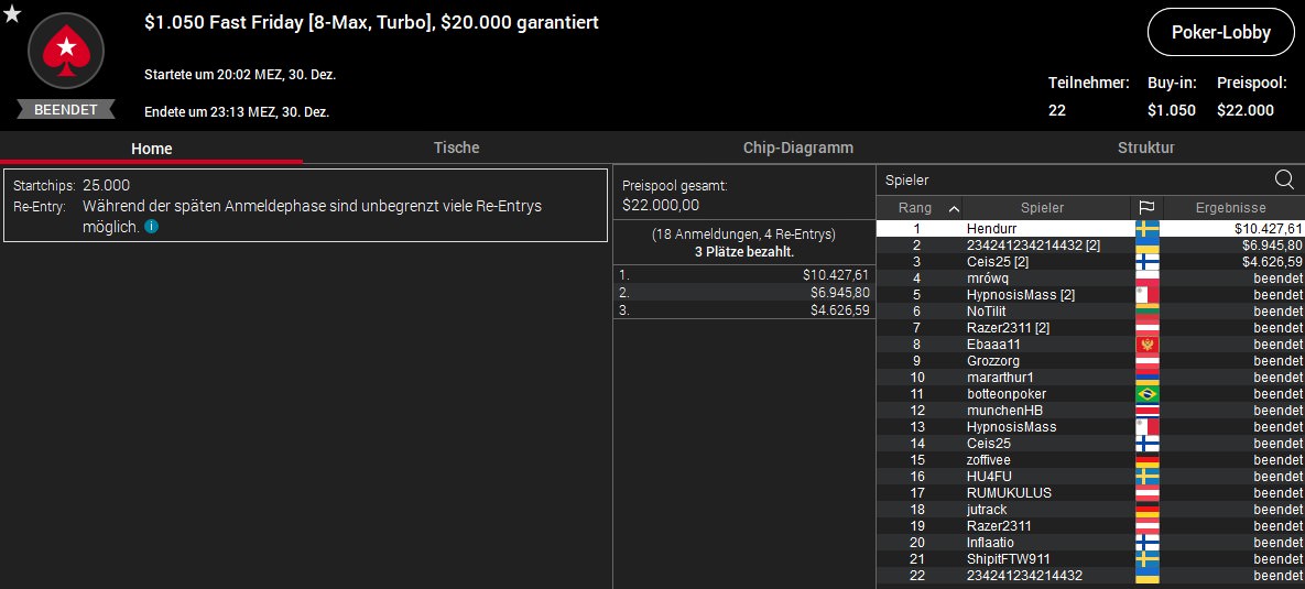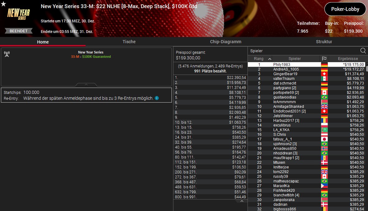 | NYS 33-M: $22 Deep Stack | $159.300 | 5 | dat schmeckt (DE) | $5.779 |