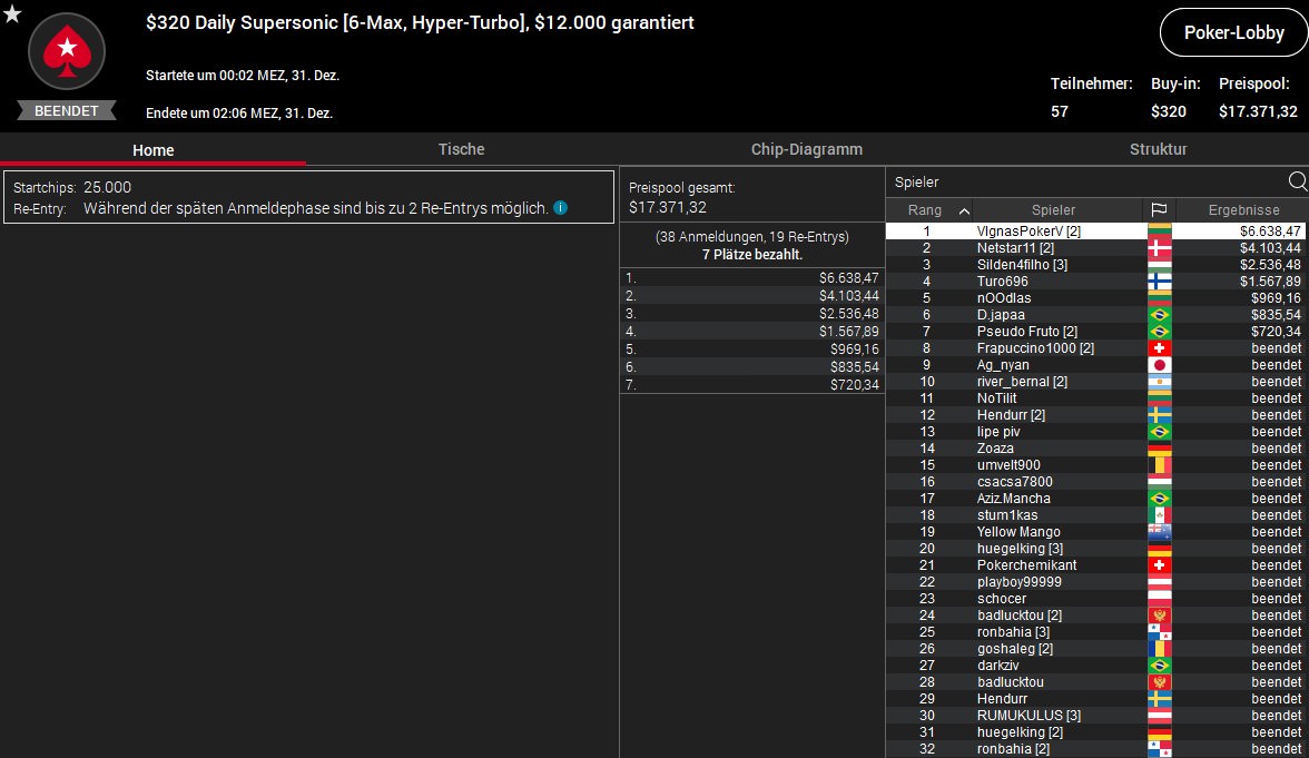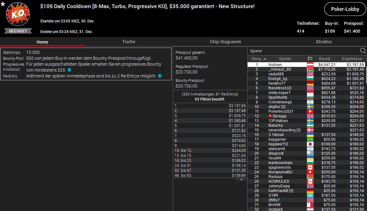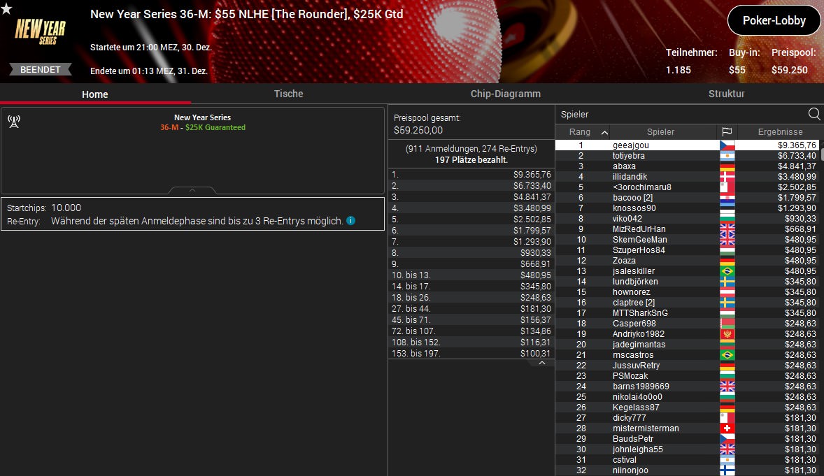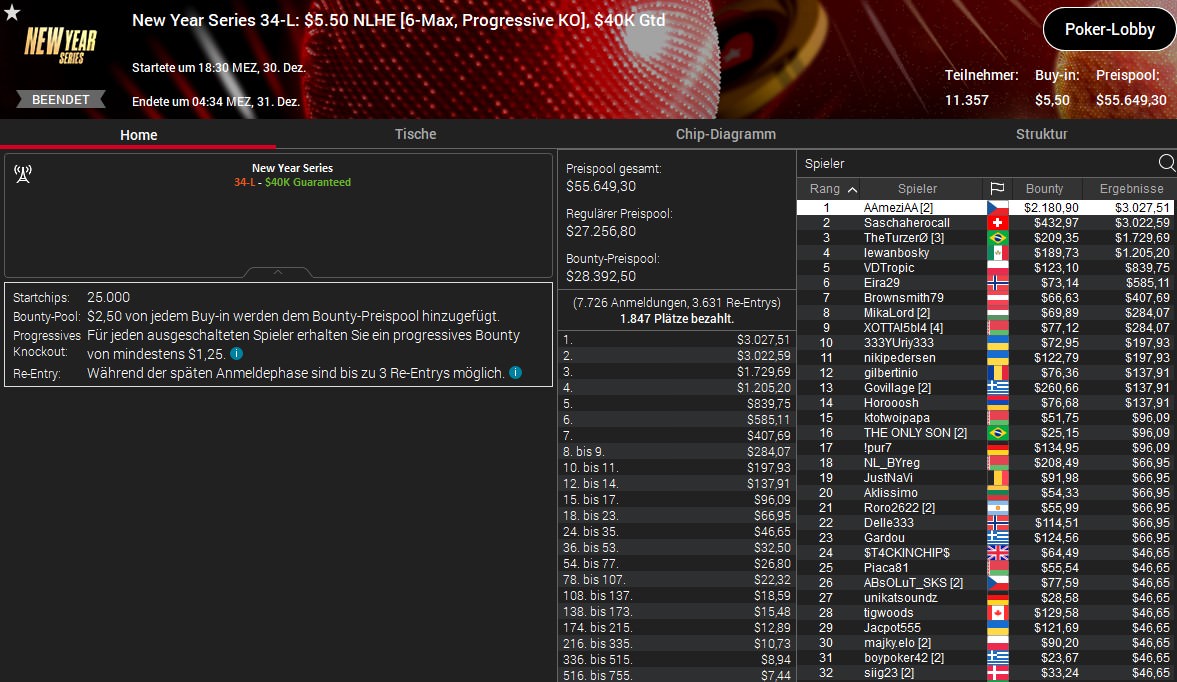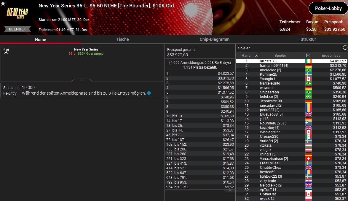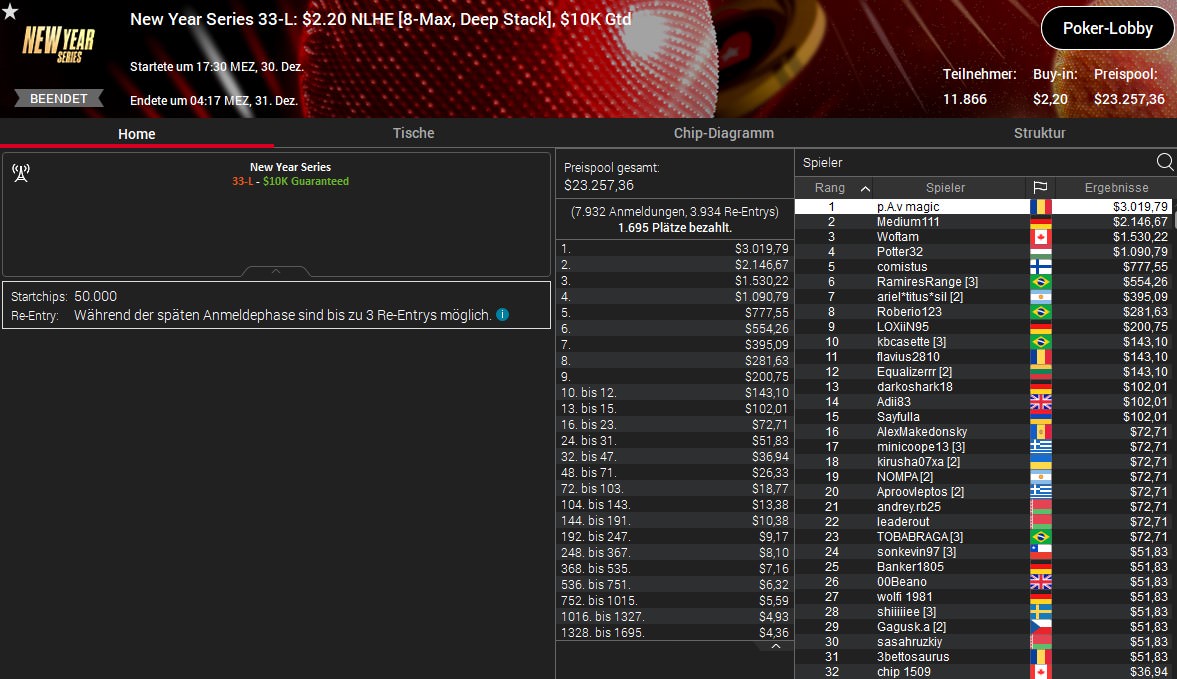 | NYS 33-M: $22 Deep Stack | $159.300 | 5 | dat schmeckt (DE) | $5.779 |