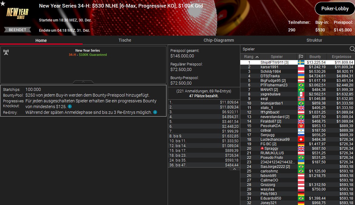 | NYS 34-H: $530 NLHE 6-Max PKO | $145.000 | 3 | Schildy1984 (DE) | $13.450 |