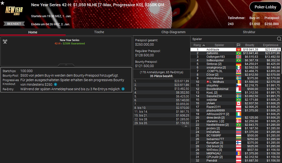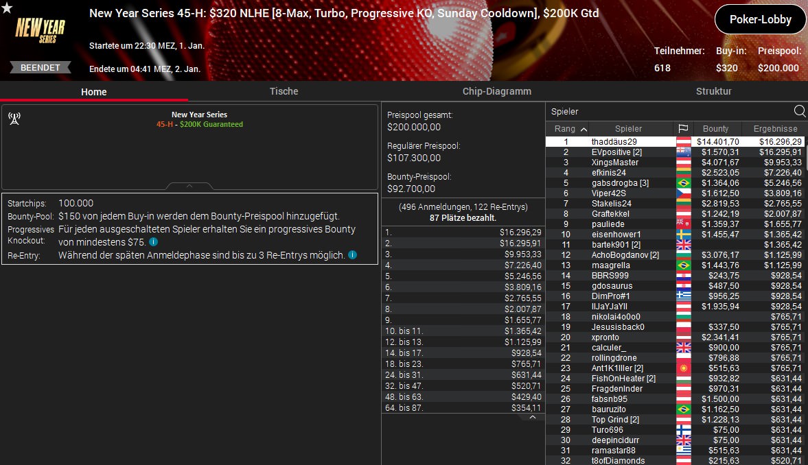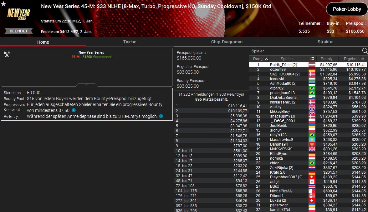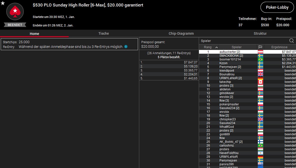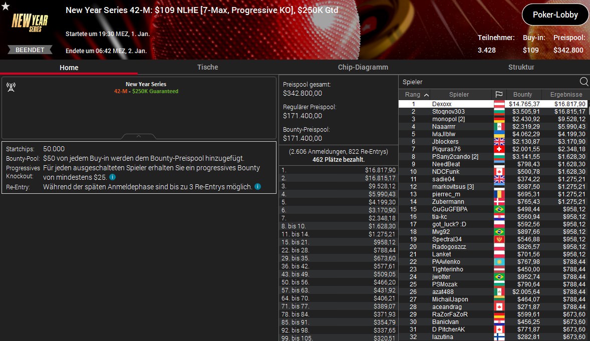 Die höchsten Auszahlungen gab es für die in Österreich lebenden Dexoxx und thaddäus29. Dexoxx setzte sich beim $109 NLHE 7-Max PKO in einem Feld mit 3.428 Entries durch nund bekam $16.817 Prämie plus $14.765 an Bounties ausbezahlt. Für thaddäus29 brachte der Sieg beim $320 Sunday Cooldown $16.396 plus $14.401.