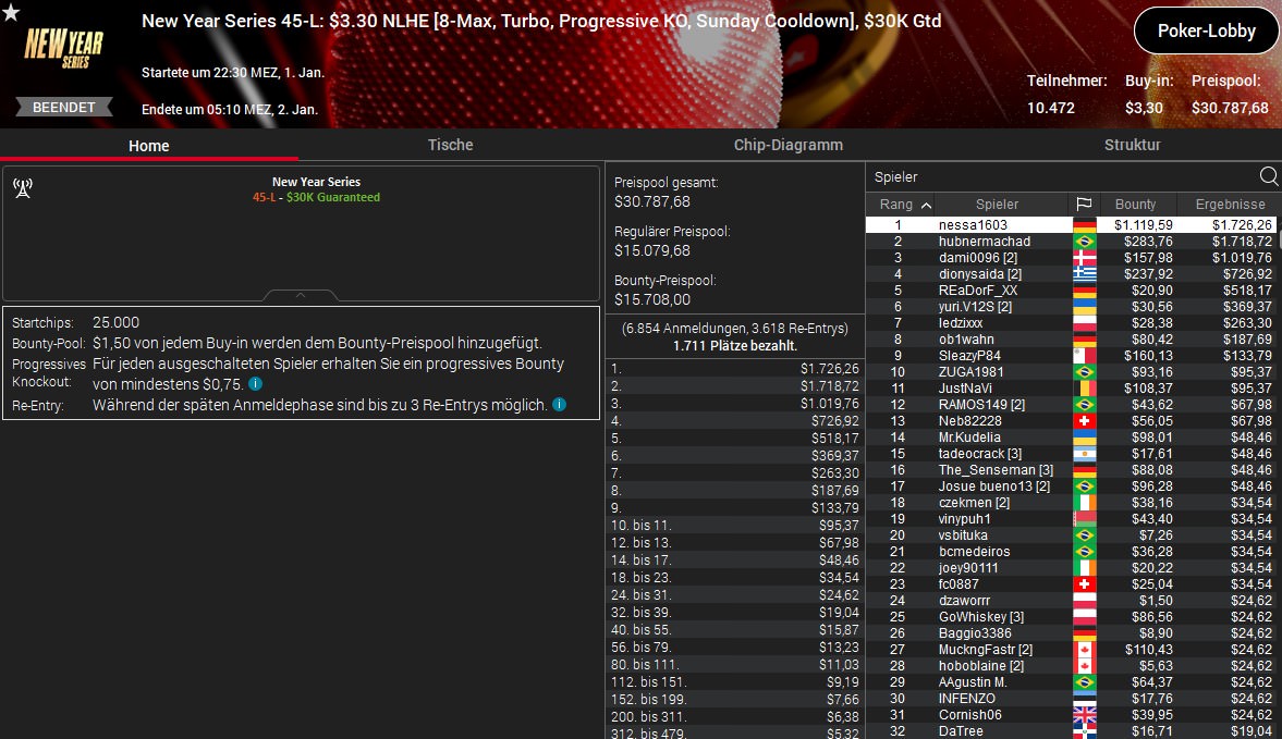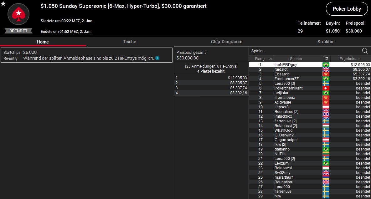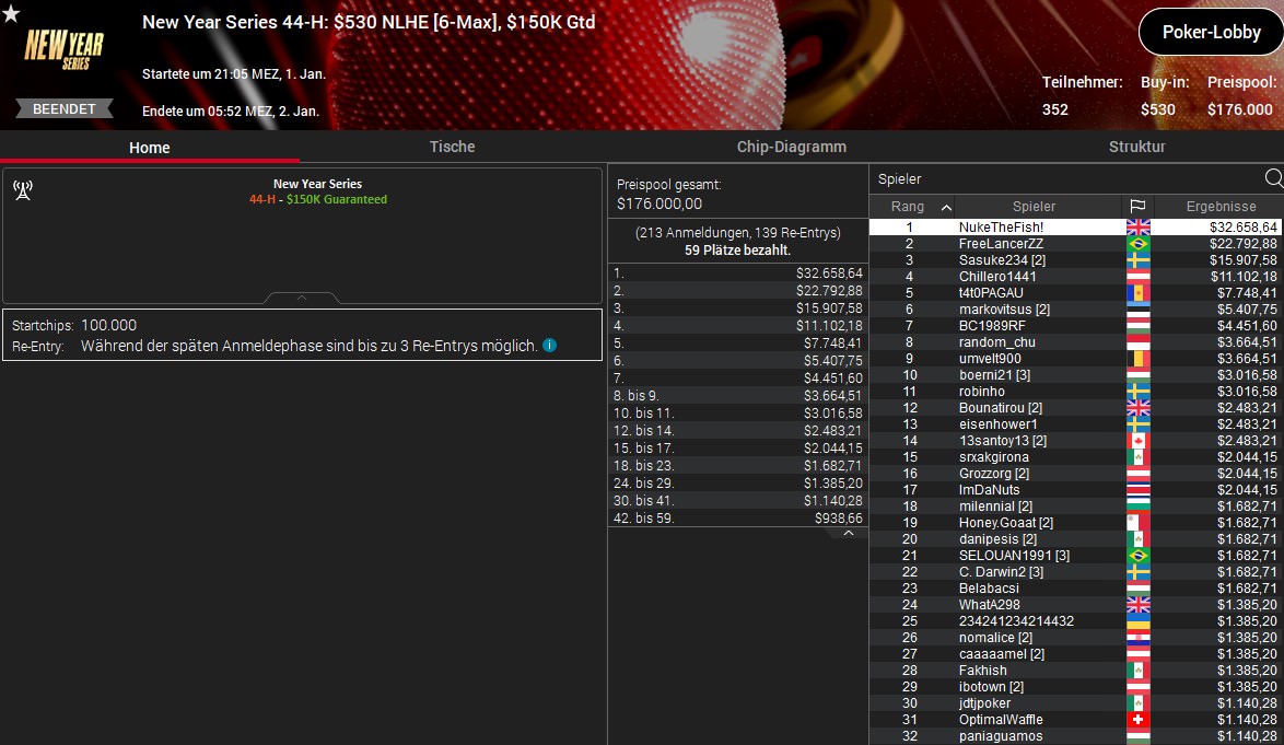 Zwei Spieler aus Deutschland gewannen Turniere bei den kleineren Buy-ins. Herdernase88 setzte sich beim $5,50 NLHE 6-Max in einem Feld mit 8.841 Entries durch und kassierte $7.011, nessa1603 ließ beim $3,30 Sunday Cooldown 10.471 Entries hinter sich und freute sich über $1.176 plus $1.119.
