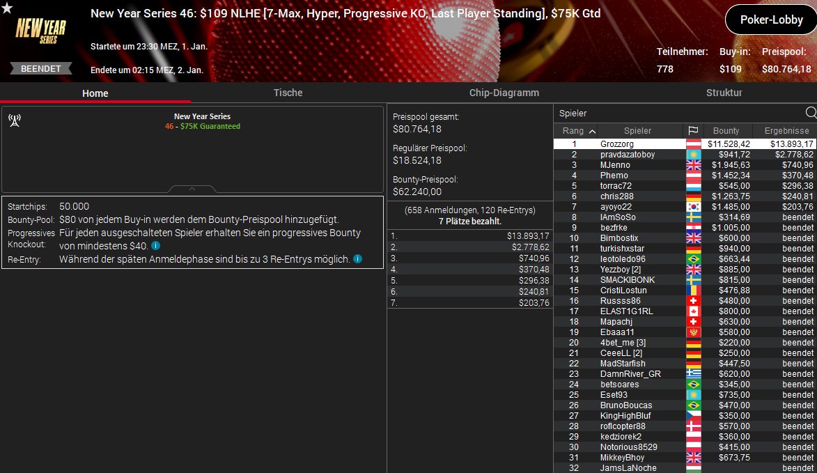 Den besten Stundenlohn verbuchte Grozzorg aus Österreich beim $109 Last Player Standing. Nach 2 Stunden und 45 Minuten Spielzeit spülte ihm Platz eins $13.893 Preisgeld plus $11.528 an Bounties in die Bankroll.