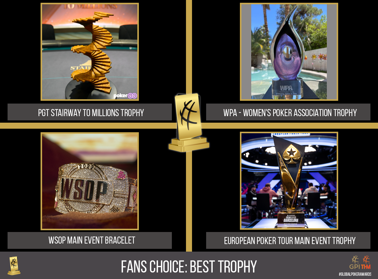 Bei der besten Trophäe können die Fans im Finale zwischen EPT Main Event Trophäe, PGT Stairway Trophäe, der WPA Women’s Poker Association Trophäe und dem WSOP Main Event Bracelet entscheiden.