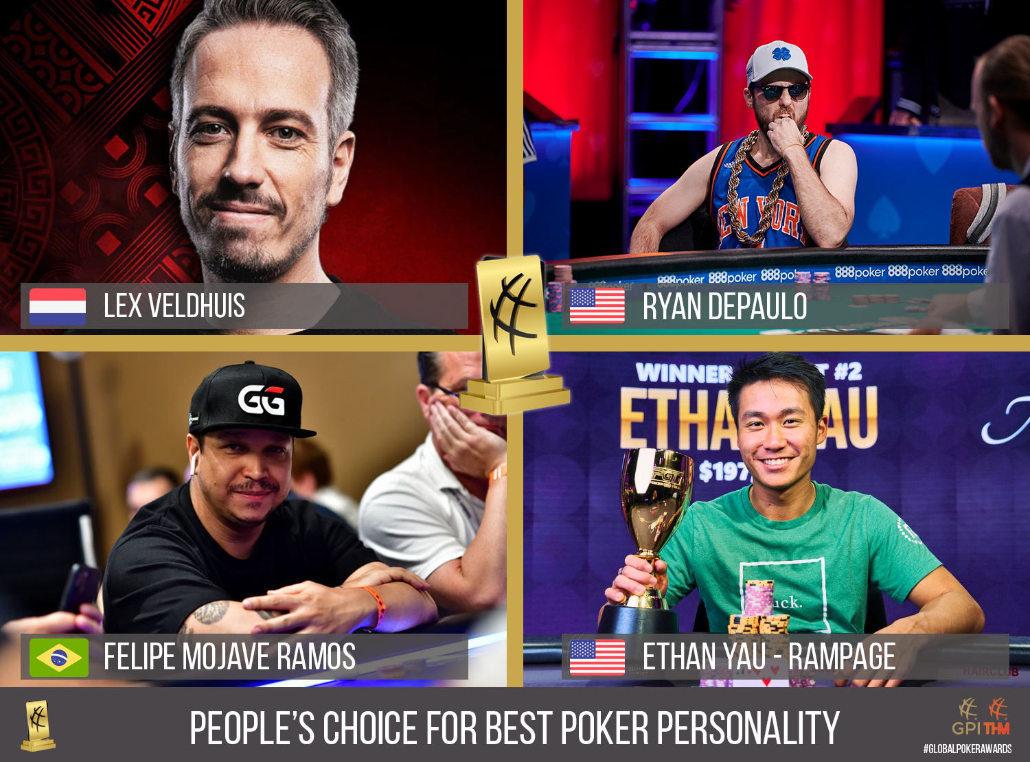 Drei weitere Kategorien stehen in der Fan-Abstimmung im Finale. Die beste Poker-Persönlichkeit: Hier stehen Rampage, Ryan DePaulo, Felipe Ramos und Lex Veldhuis im Duell.