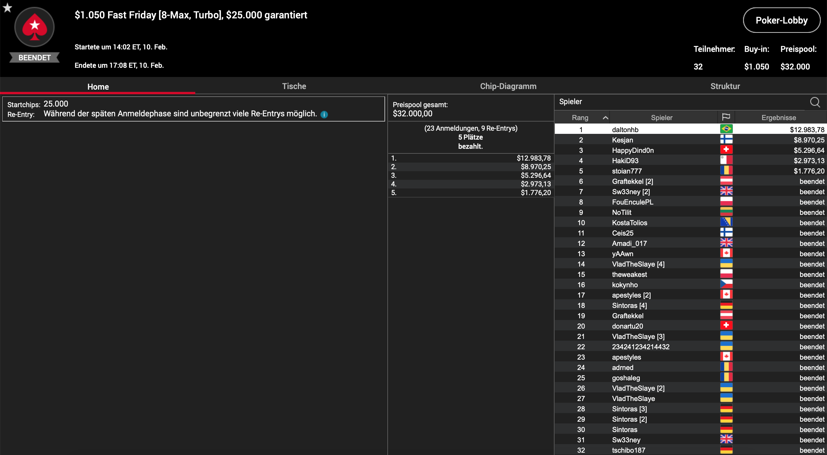 Das teuerste Turnier des Tages vereinigte 32 High Roller, so dass die garantierten $25.000 überboten wurden. Der Fast Friday hielt was er versprach und nach nur knapp 3 Stunden standen die Spieler im Preisgeld und der Sieger fest. Während der Schweizer User „HappyDind0n“ Platz 3 ($5.296) belegte, musste er das Heads-Up Jan-Mikael „Kesjan“ Kesänen aus Finnland und Dalton „daltonhb“ Hobold aus Brasilien überlassen. Für den Finnen standen am Ende $8.970 und für den Brasilianer der Turniersieg und $12.983 zu Buche.