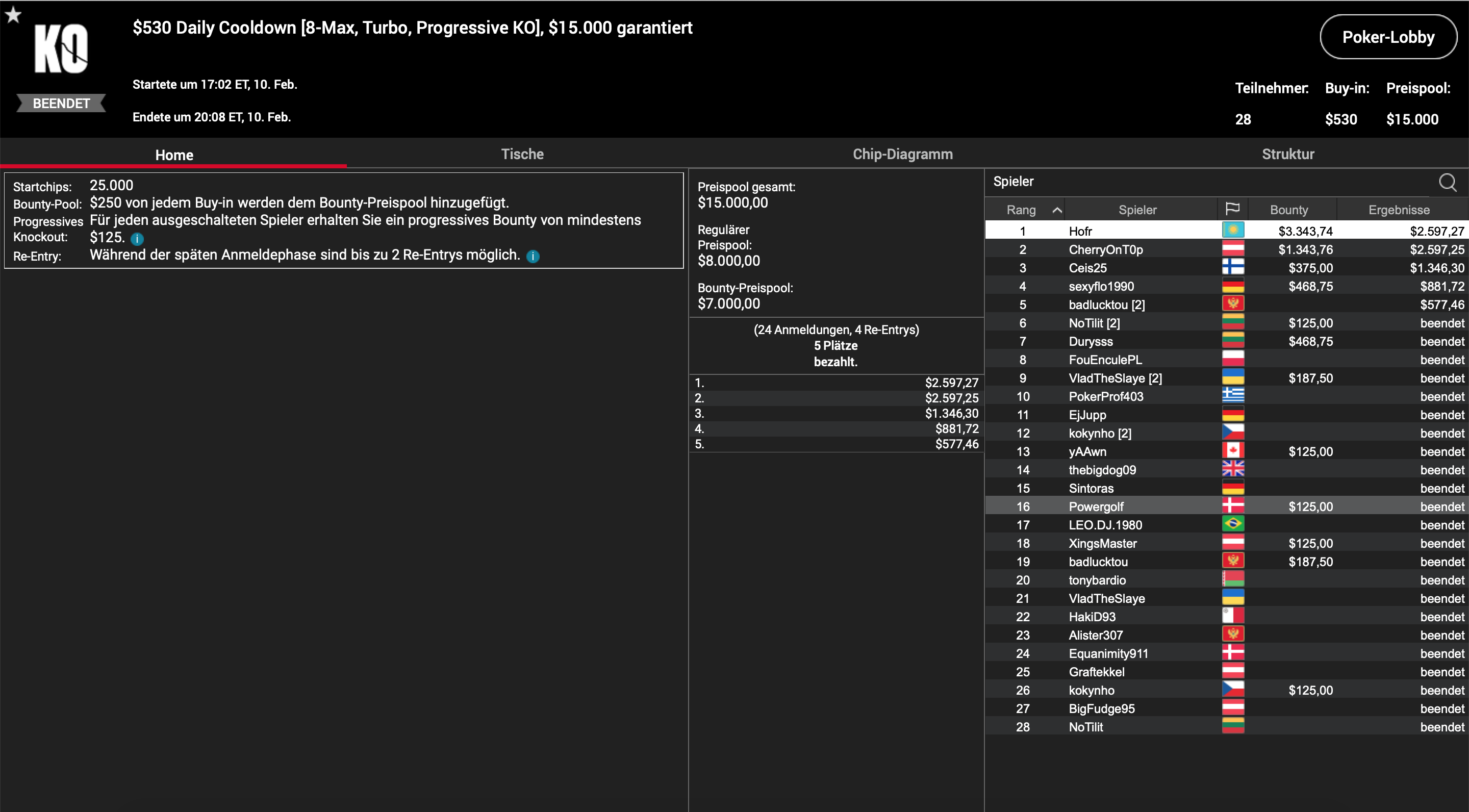 28 Starts im $530 Daily Cooldown bedeuten in dem Turnier mit einer Garantie von $15.000 ein Overlay von $1.000. Nach 3 Stunden Spielzeit waren es „Hofr“ aus Kasachstan und der schwedische Wahlösterreicher „CherryOnT0p“, die sich den Sieg und das verbleibende Preisgeld zu je $2.597 teilten. Dazu kamen noch $3.343 für den Kasachen und $1.343 für den Österreicher. Ebenfalls ins Geld schaffte es „sexyflo1990“ aus Deutschland auf Platz 4 ($881+$496).