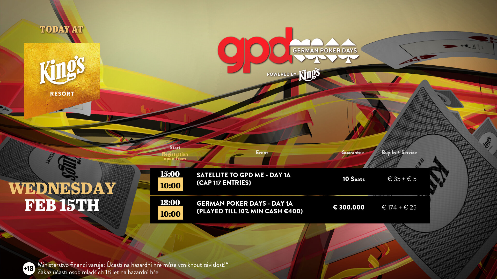 Heute starten im King’s Resort die großen German Poker Days. Um 18:00 Uhr findet Flight 1a des €174+25 Main Event statt – €300.000 werden hier garantiert. 10% der Spieler aus dem Flight kommen in Tag 2 und haben dort bereits €400 sicher.