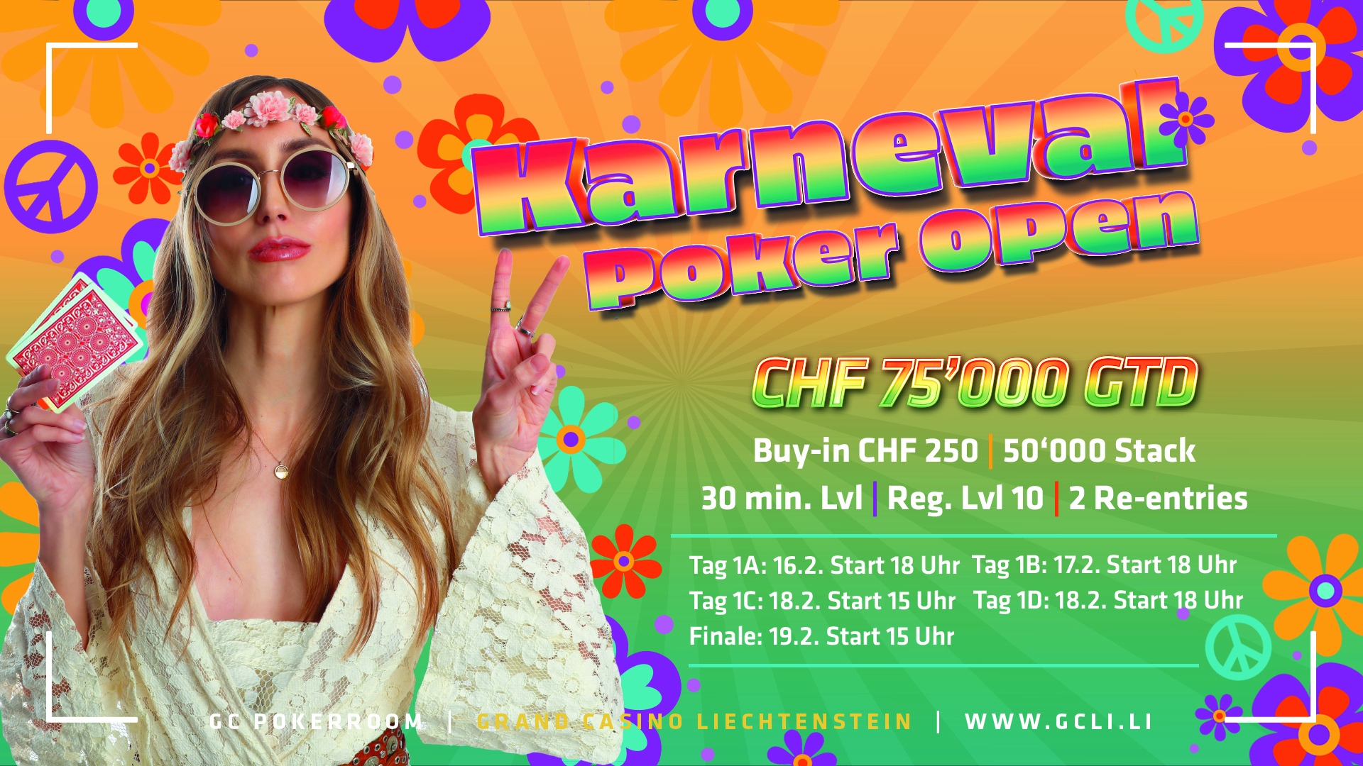 Am Donnerstag starteten im GC Pokerroom des Grand Casino Liechtenstein die CHF 220+30 Karneval Poker Open (KPO) mit dem ersten von vier Starttagen Eins. Bei dem Event geht es mindestens um ein Preisgeld von CHF 75.000.