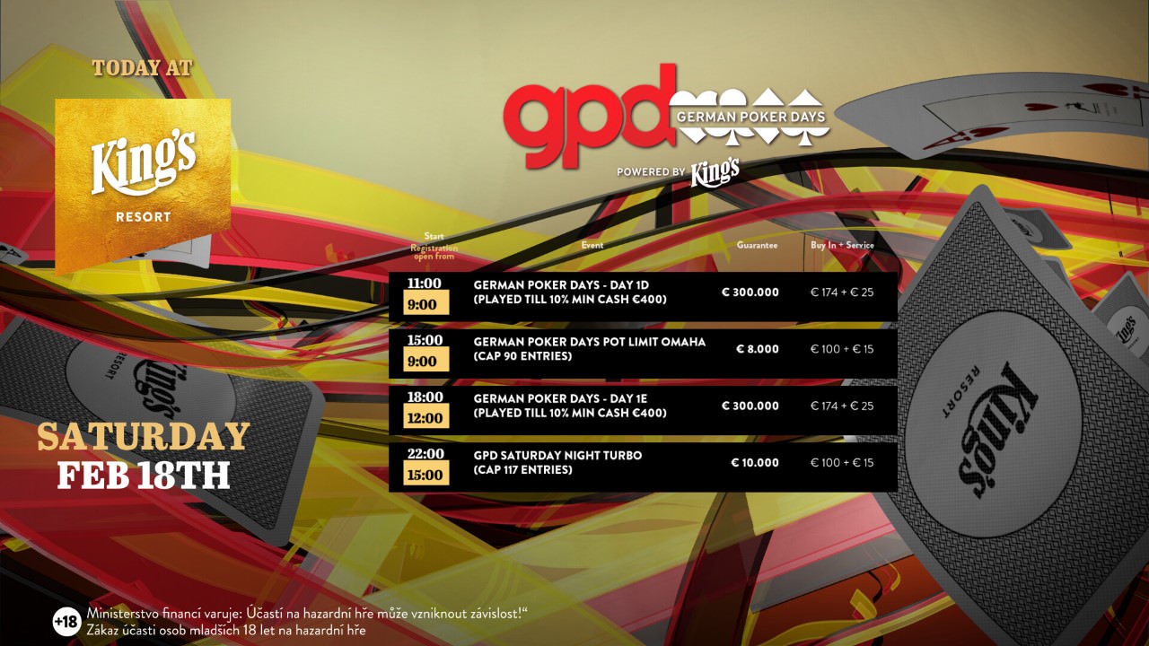 Neben den beiden Starttagen beim GPD Main Event um 11 und 18 Uhr stehen noch um 15 Uhr das €100+15 GPD Pot-Limit Omaha und um 21 Uhr das €100+15 GPD Saturday Night Turbo auf dem Turnierplan.