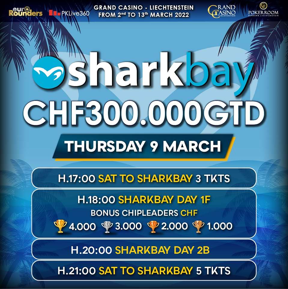 Im GC Pokerroom des Grand Casino Liechtenstein wurde am Mittwoch im Zuge des sharkbay Festival powered by EuroRounders.com der Tag 1e des CHF 350+50 NLH sharkbay Main Events gespielt, bei dem ein Preisgeld von CHF 300.000 garantiert wird.