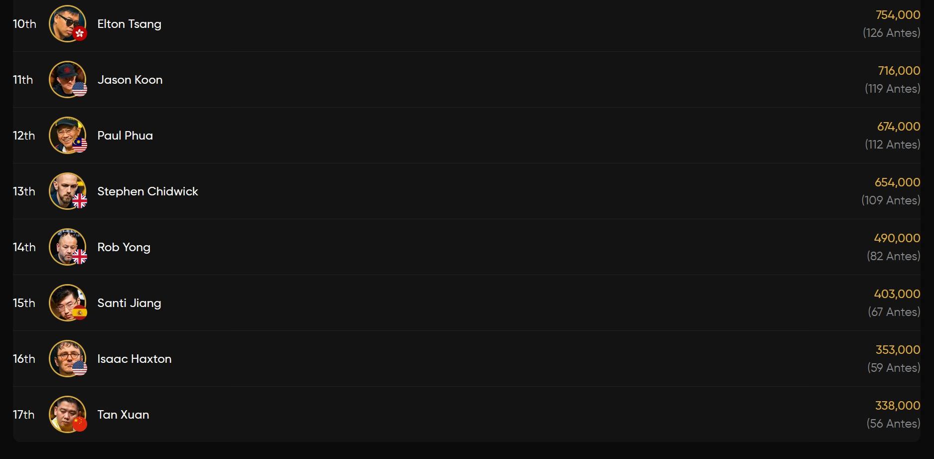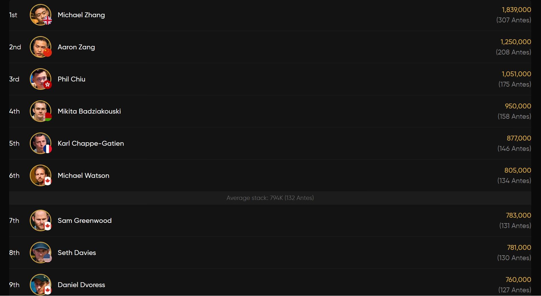 In Führung liegt der Brite Michael Zhang vor Aaron Zang, der schon beim 50k Short Deck einen Deep Run hingelegt hatte.