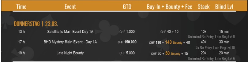 Um 17:00 Uhr ist es dann soweit – das BHD Mystery Main Event startet. Für 330 CHF (110+140+40 CHF) erhält jeder 40.000 Jetons. In dem ersten 10 der 30-minütigen Blindlevel sind jeweils 2-Re-Entries erlaubt. Die Bounties im Main Event sind allesamt Mystery Bounties. Die Garantie beträgt 150.000 CHF.