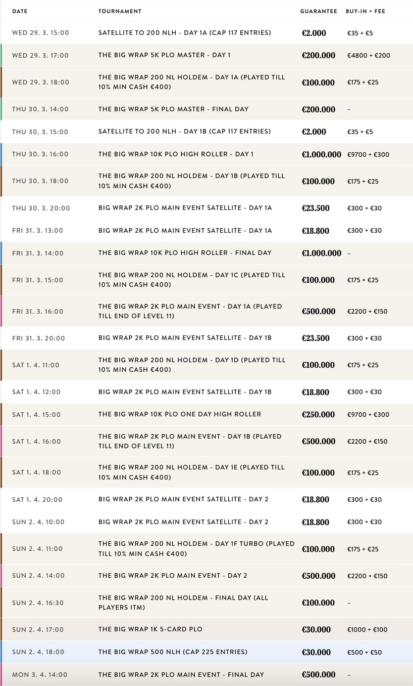 Dazu kommen noch €1.000+100 5-Card-PLO am Sonntag mit €30.000 Garantie sowie ein €500+50 Big Wrap NLH 500 mit auch €30.000 Garantie.