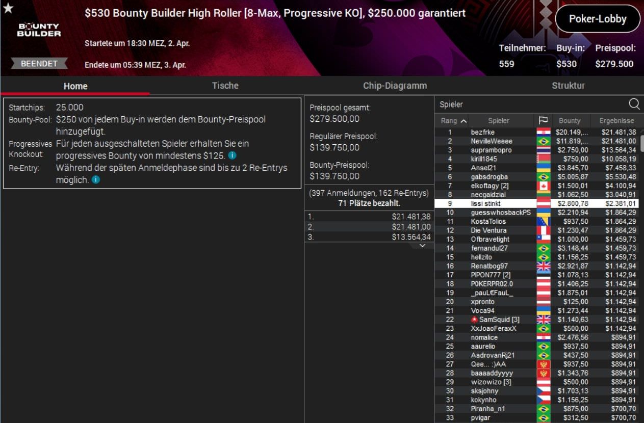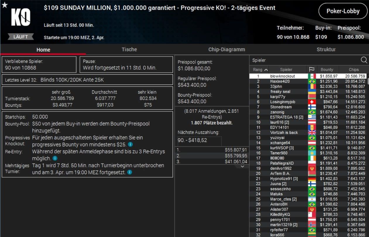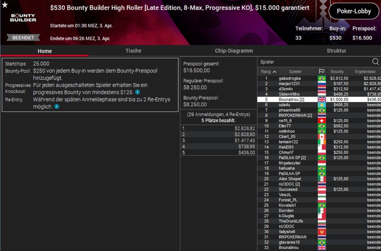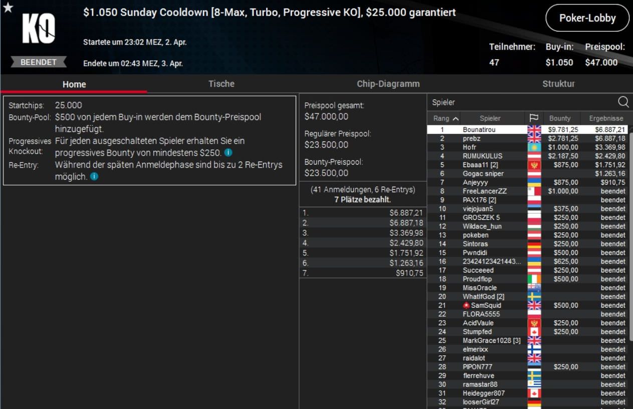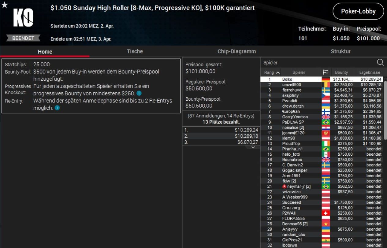Größter deutschsprachiger Gewinner war aber „Bolko“, der sich das $1.050 Sunday High Roller unter den Nagel riss.