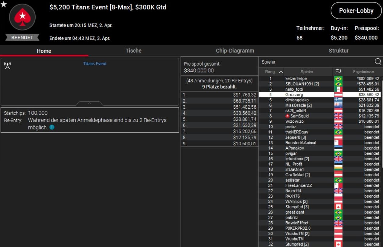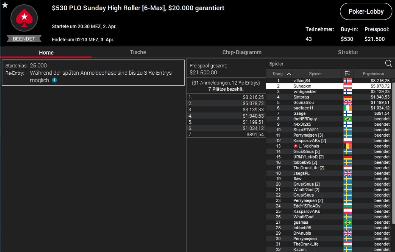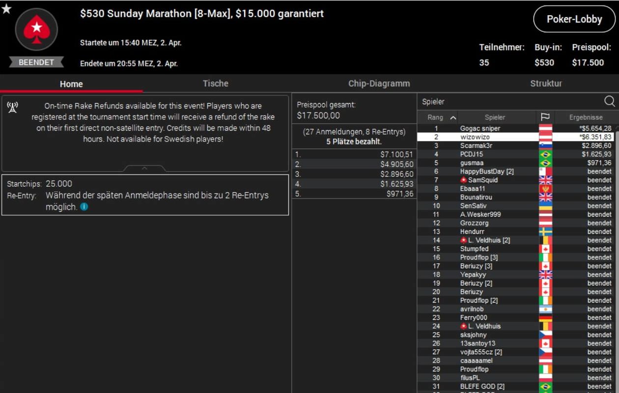 Zudem holte die DACH-Fraktion noch zwei Plätze durch Ole „wizowizo“ Schemion beim $530 Sunday Marathon (gut $6.350 Preisgeld) und „Suhepxm“ beim $530 PLO High Roller (gut $5.000 Preisgeld) und einige weitere gute Ergebnisse, die ihr in der Übersicht findet.