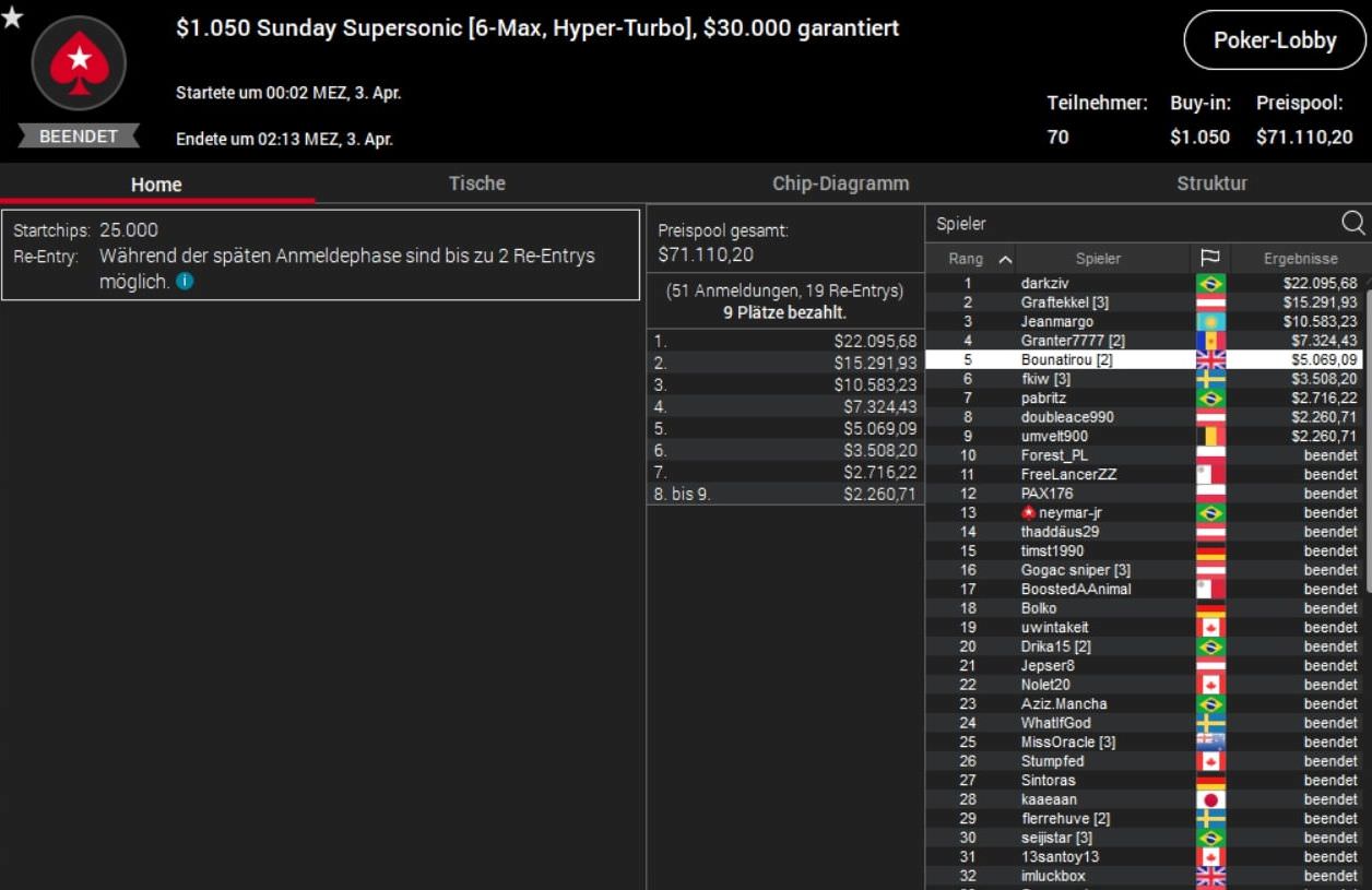 Neben dem Gewinn des $1.050 Cooldown, für den es über $16.000 Preisgeld gab, räumte er noch gut $5.000 für Platz 5 beim $1.050 Supersonic und gut $1.600 für Platz 6 beim $530 Bounty Builder Late Edition ab.