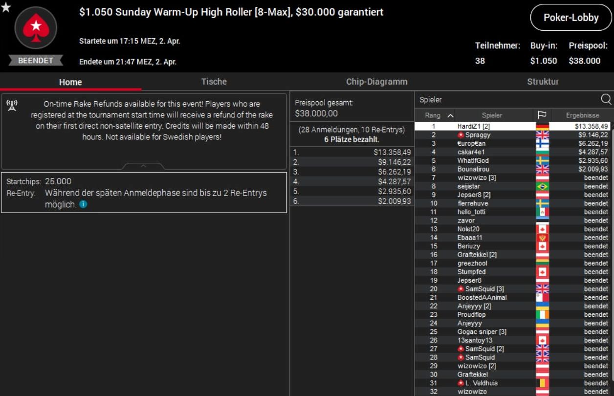 Für Platz 1 beim $1.050 Warm-Up kassierte er über $13.000 Preisgeld und zählte damit ebenfalls zu den großen Gewinnern des Sonntags.