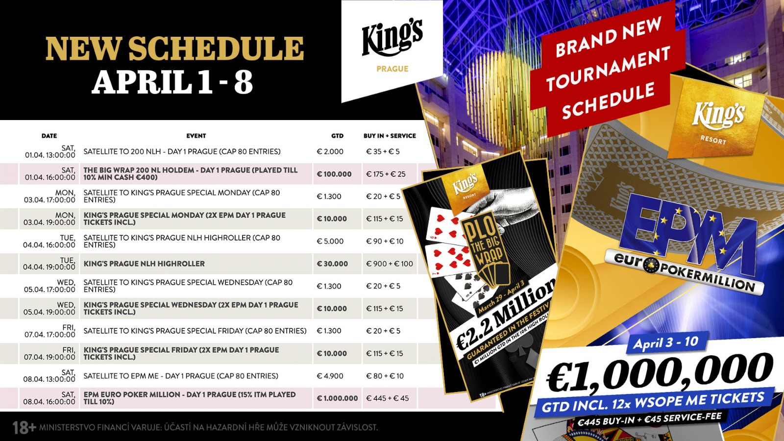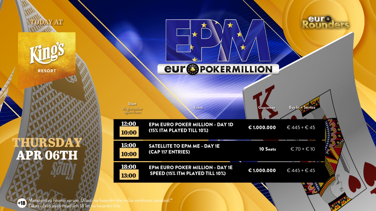 Heute gibt es im King’s Resort Rozvadov gleich zwei Starttage bei der Euro Poker Million. Um 12 Uhr beginnt Tag 1D und um 18 Uhr wird Tag 1E angepfiffen. Dazwischen gibt es noch um 15 Uhr ein €70+10 Satellite zu Tag 1E, bei dem 10 Tickets garantiert werden.