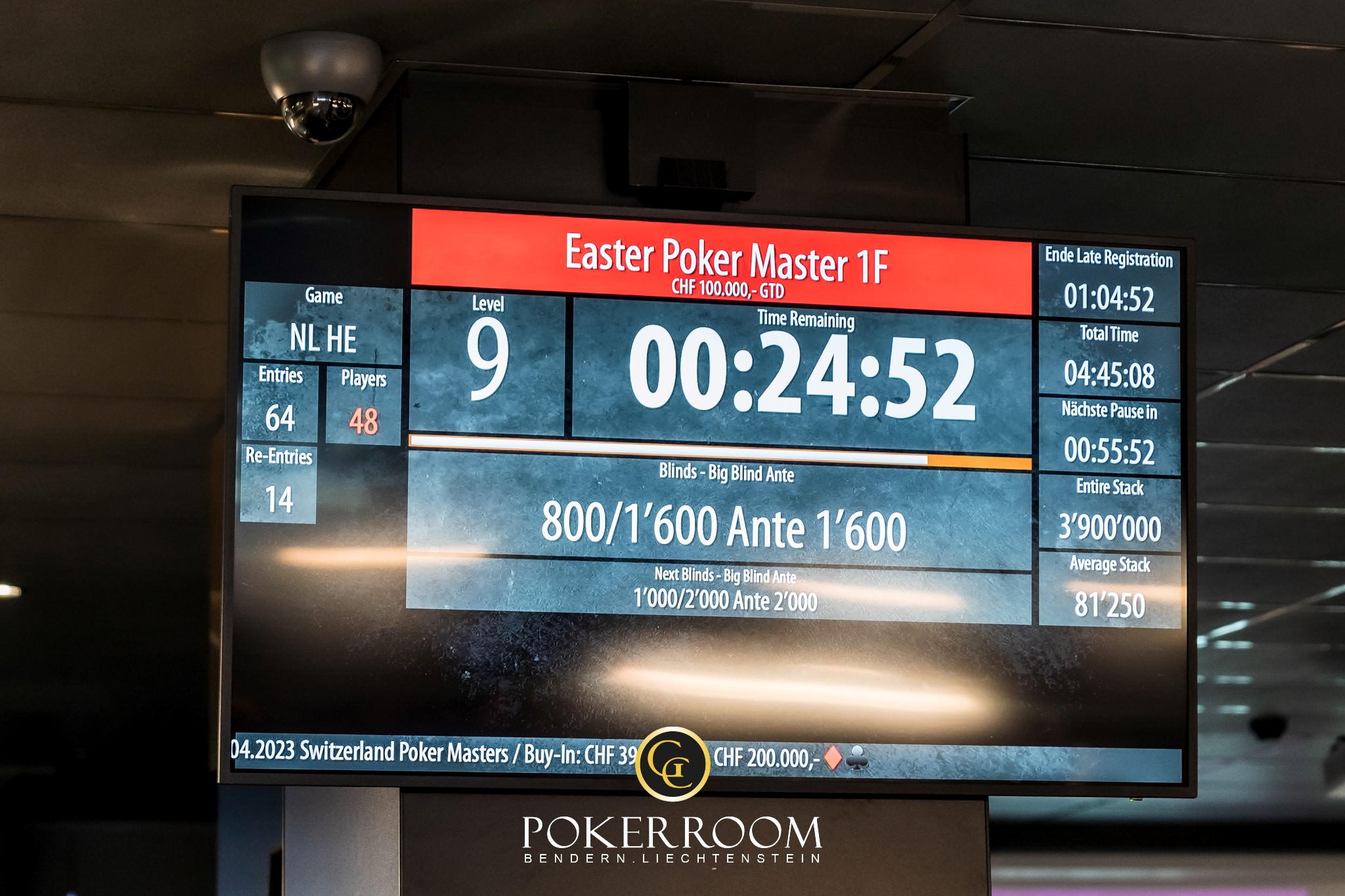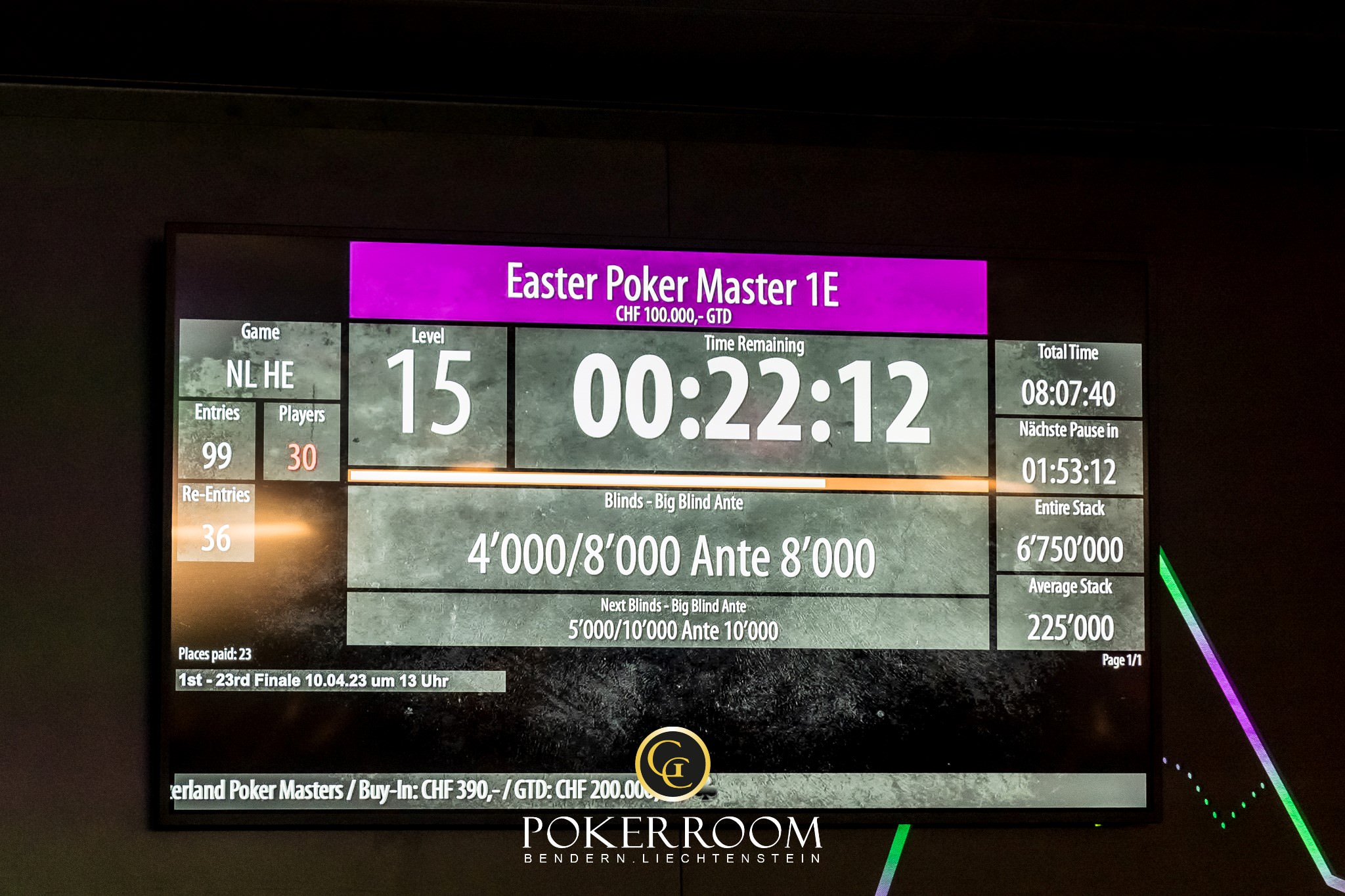 Heute gibt es bei den Easter Poker Master in Liechtenstein um 13:00 Uhr die Entscheidung der Easter Poker Master. 112 Spieler kommen dazu an die Tische in Bendern zurück, CHF 37.100 warten auf den Sieger. Alle haben bereits CHF 440 sicher.