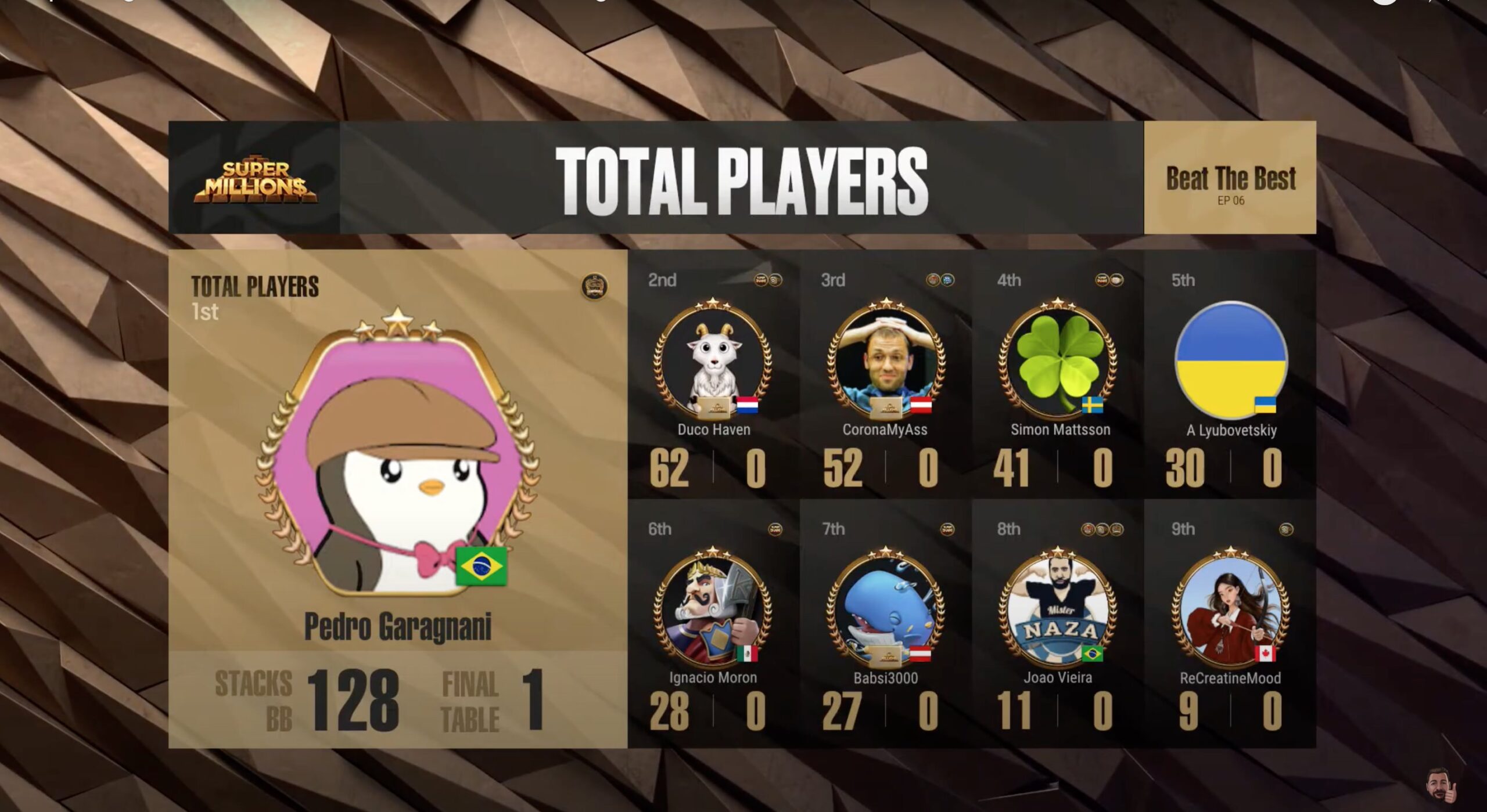 $10.000 Buy-In, 776 Starter, $5 Millionen garantiert, $7.760.000 Preispool, über 1 Million Dollar für den Sieger und das Online! Das sind die Eckdaten des GGPoker Super Millions High Roller Beat the Best Tourneys. Der Finaltisch, der am Abend startete hatte es in sich: Mit dem Mexikaner Ignacio Moron saß ein Super Million Champion am Tisch, mit dem Niederländer Duco ten Haven und dem Schweden Simon Mattsson nahmen sogar zwei doppelte Super Millions Sieger Platz.