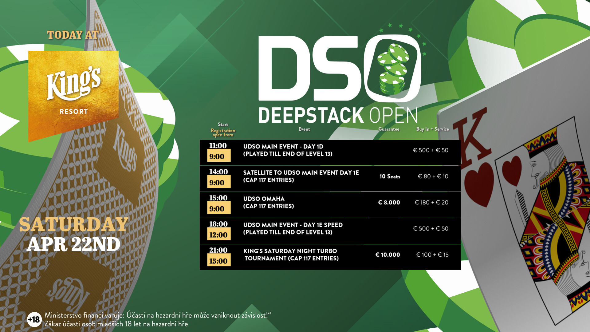 Um 15 Uhr beginnt zudem das €180+20 UDSO Omaha, und um 21 Uhr kann man noch ins €100+15 King’s Saturday Night Turbo einsteigen.