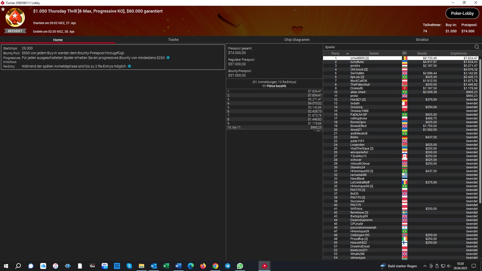 Beim $1.050 Thursday Thrill kamen dieses Mal 74 Entries zusammen und so wurden $74.000 ausgespielt. Am Ende konnte sich der Belgier „umvelt900“ den Sieg und $7.834 + $9.730 Bounties sichern. Der Österreicher „Old broke“ verpasste das Treppchen und belegte Platz 4 für $4.070 (keine Bounties).
