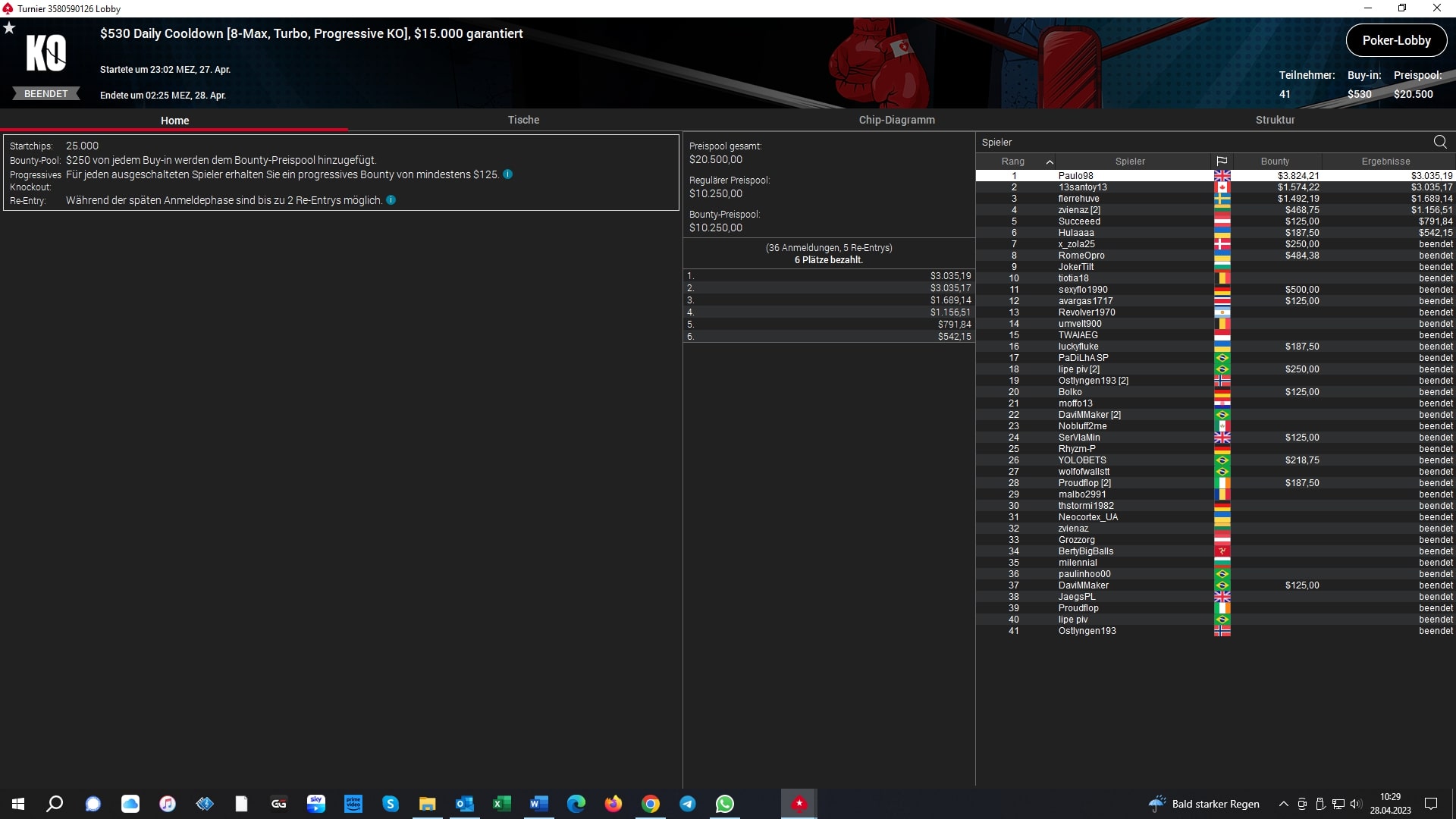 Dann siegte noch „Paulo98“ (GBR) beim $530 Daily Cooldown High Roller und räumte $3.035 + $3.824 Bounties ab. Jakob „Succeeed“ Miegel (GER/AUT) schaffte es hier bis auf Platz 5 für $791 + $125 Bounties.
