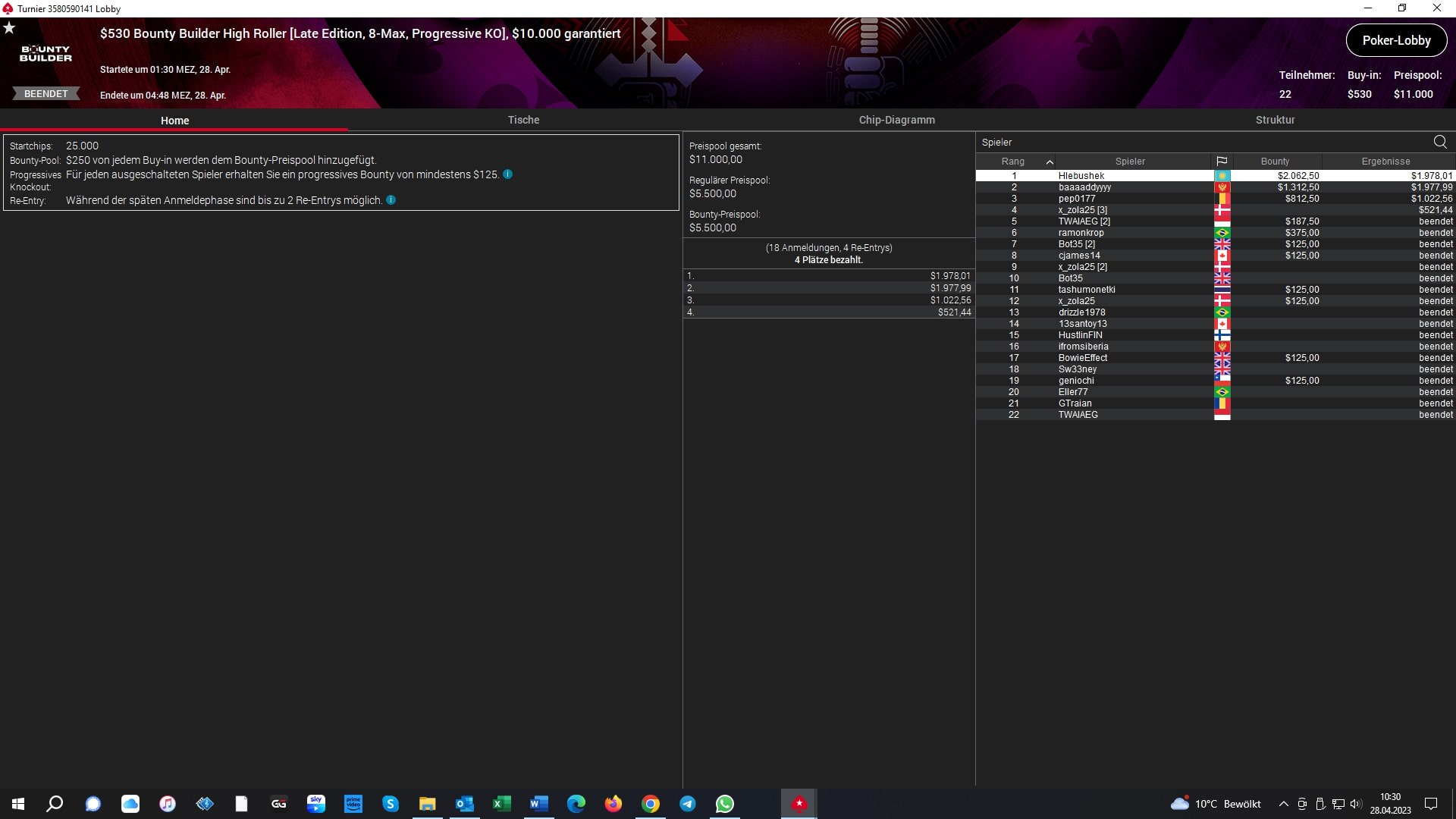 Außerdem konnte noch der Kasache „Hlebushhek“ das $530 Bounty Builder High Roller Late-Edition Event für sich entscheiden und $1.978 + $2.062 Bounties kassieren.