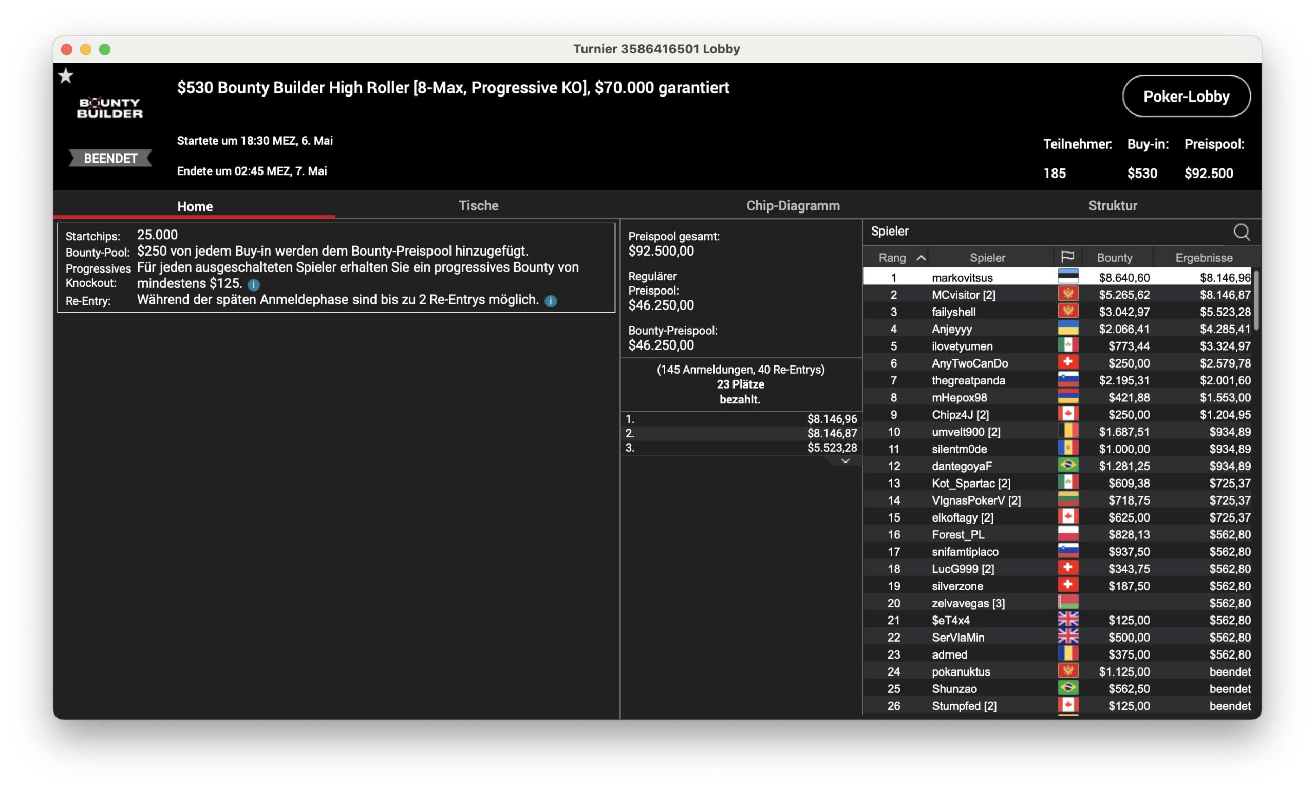 Das $530 Bounty Builder HR hatte am Samstag 185 Runner, $92.500 wurden in diesem Turnier neu verteilt. Der Sieg ging an Markku „markovitsus“ Koplimaa aus Estland für $8.640 + $8.146.